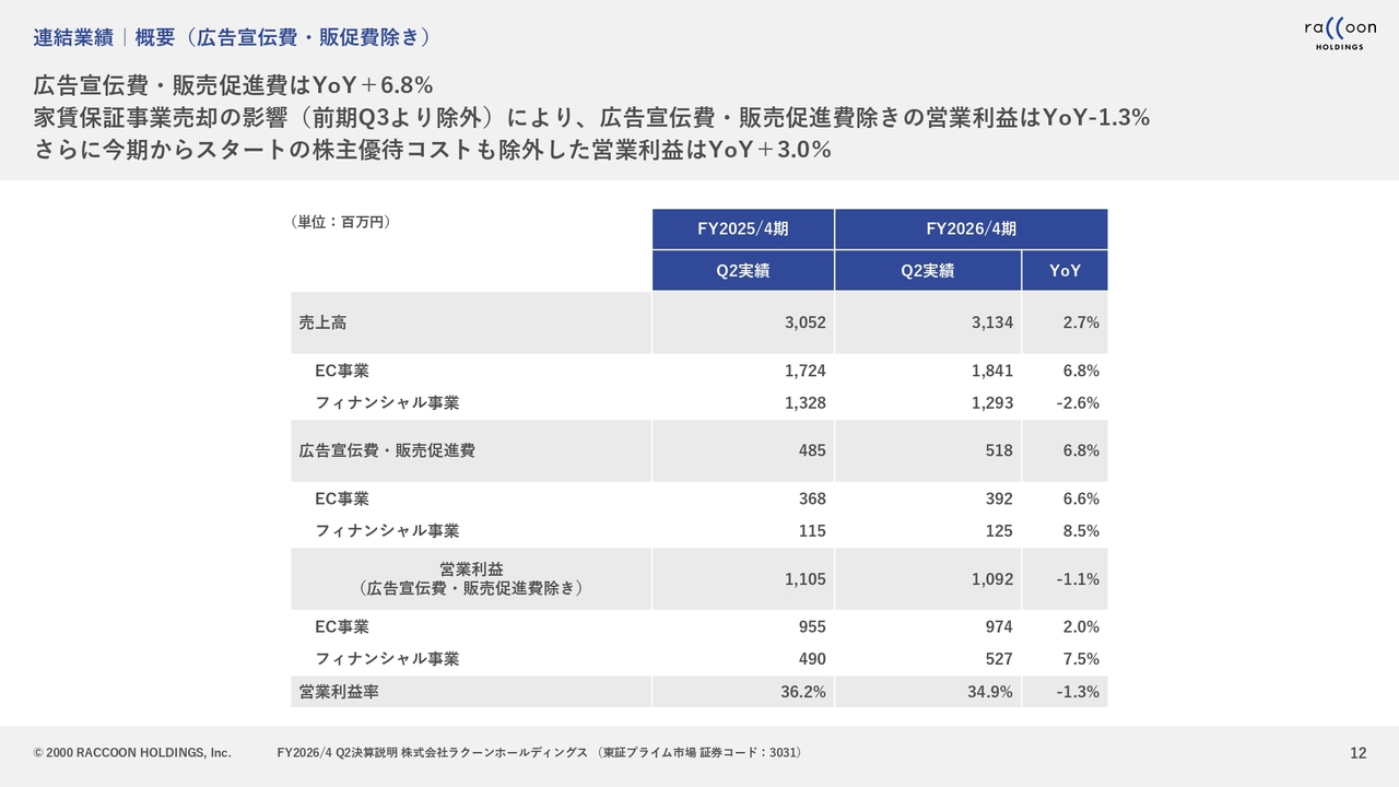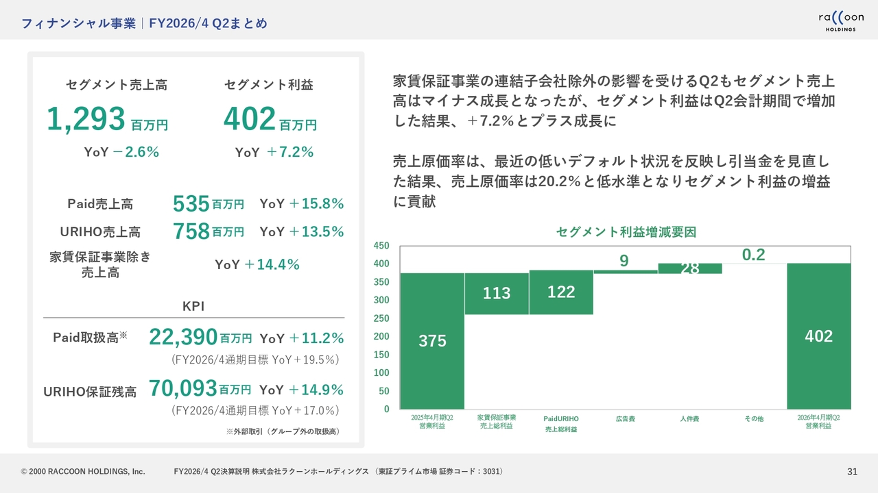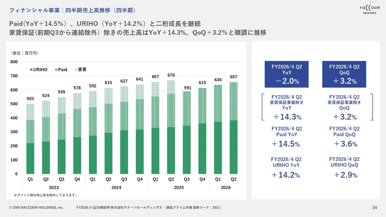 セグメント売上高については、先ほどご説明したとおり、家賃保証事業を昨年の第2四半期に売却した影響を受けています。これを除くと、売上高の成長率は14.4パーセントと、2桁成長を達成しています。