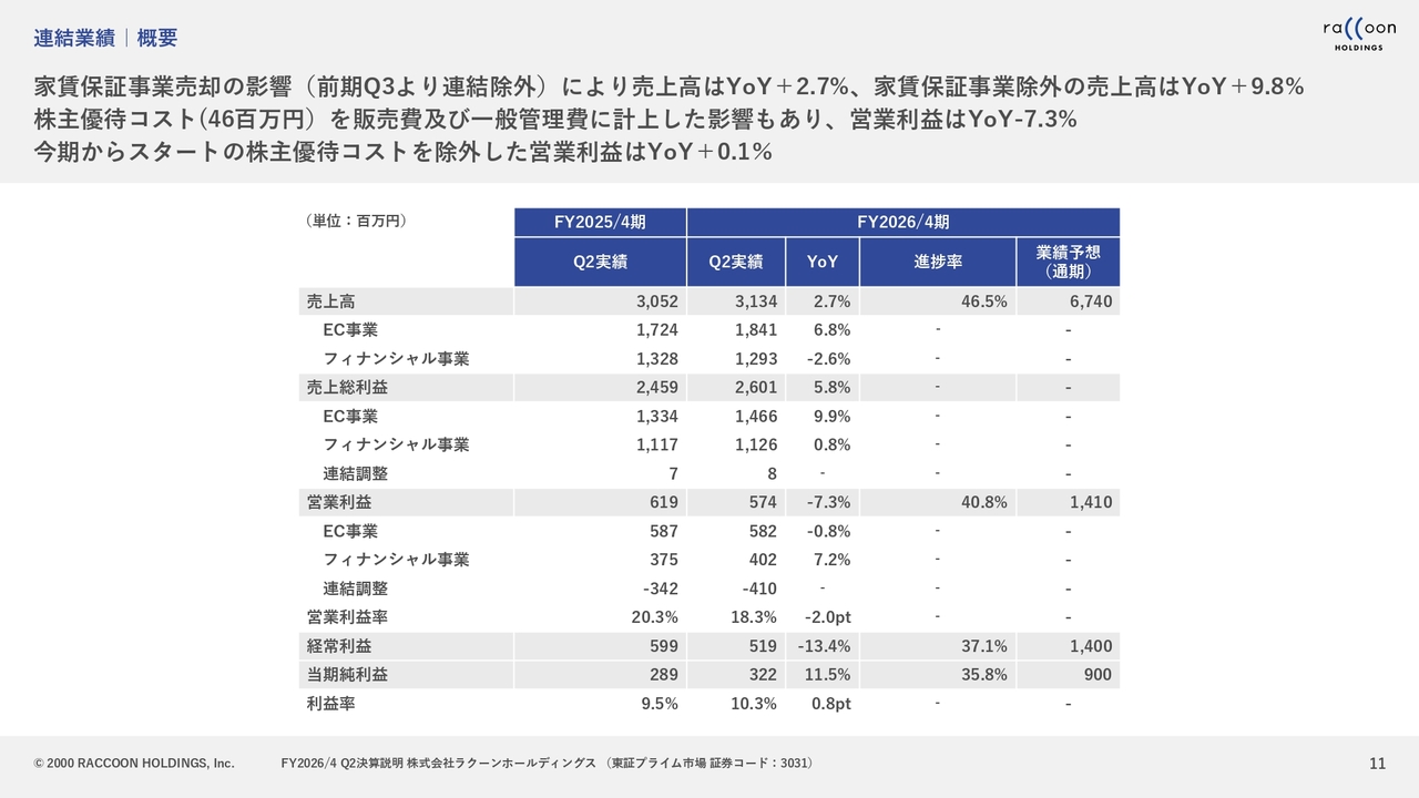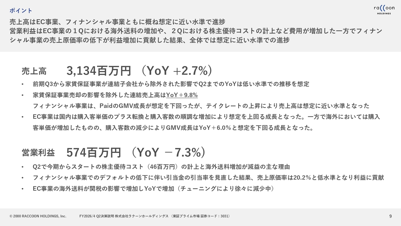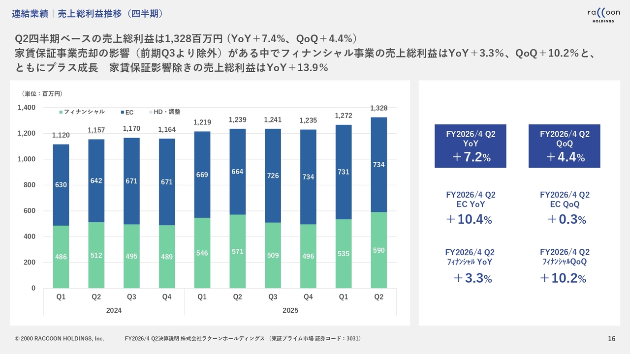 売上総利益については、第2四半期で大きく伸ばすことができました。主な要因としては、フィナンシャル事業におけるデフォルト率の低下が挙げられます。また、EC事業に関しても若干の増加が見られました。