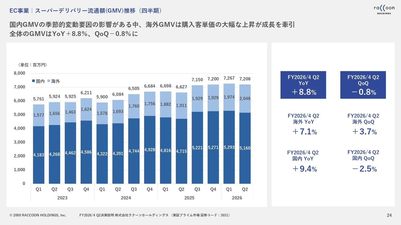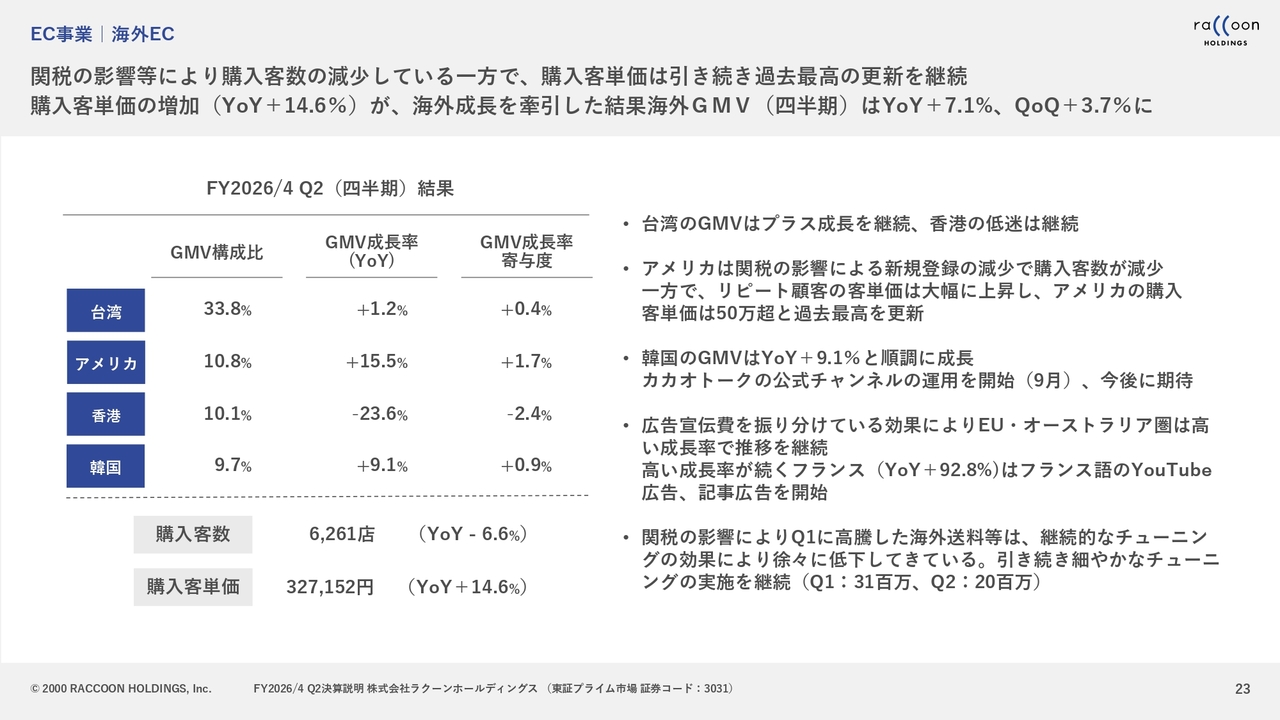 購入客数は安定的に増加し、それに伴い国内のGMV成長率は想定を若干上回る結果となりました。一方で、海外に関しては客単価が大きく増加しました。ただし、関税の影響があるアメリカ、及び以前から厳しい状況にある香港では、特に購入客数が減少しました。この影響で、GMVの成長率は残念ながら6パーセントにとどまりました。