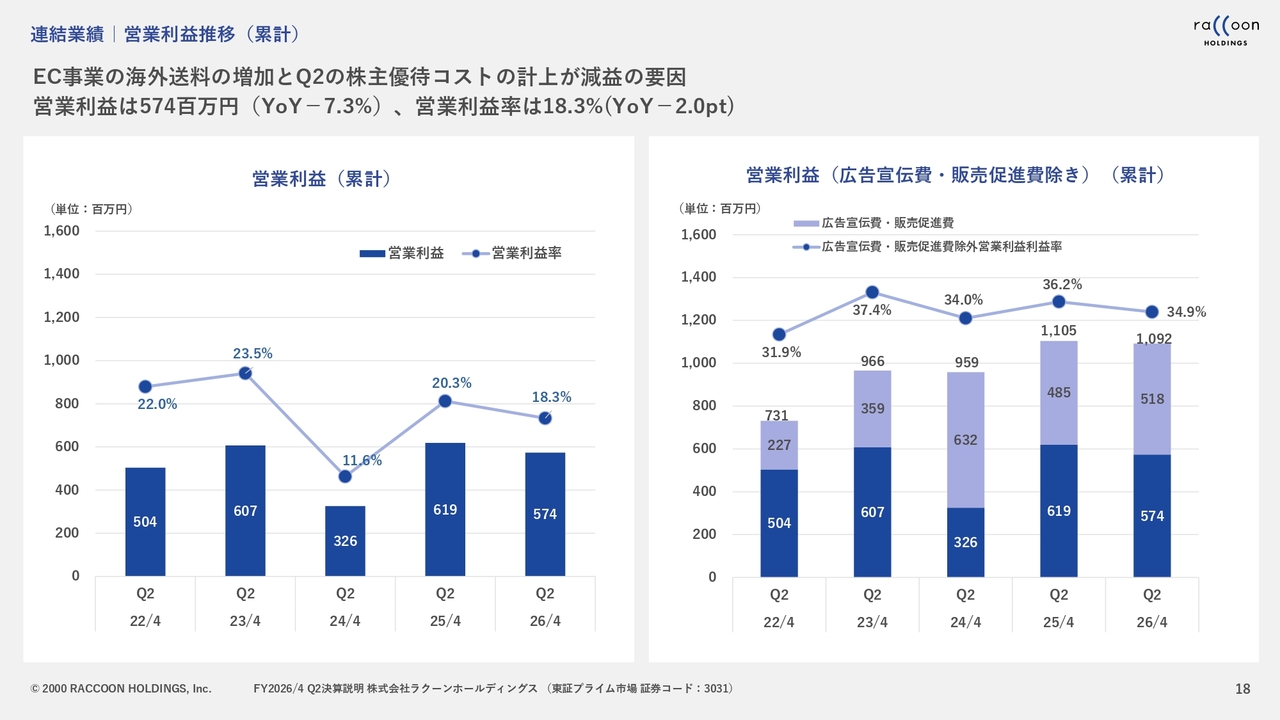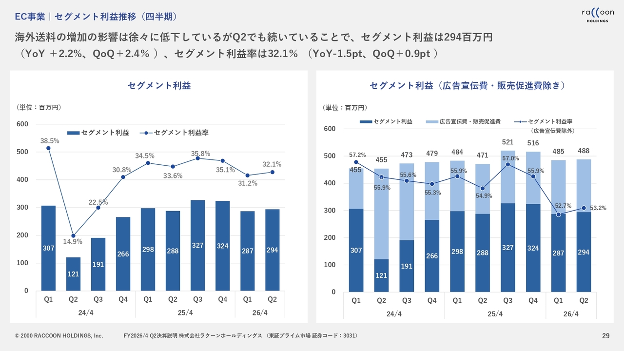 EC事業のセグメント利益の推移については、スライドのとおりです。第1四半期及び第2四半期は昨年とほぼ同水準でしたが、やはり海外送料の増加が一部影響を及ぼしました。