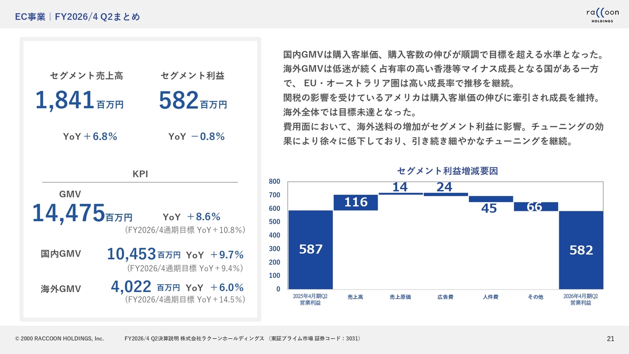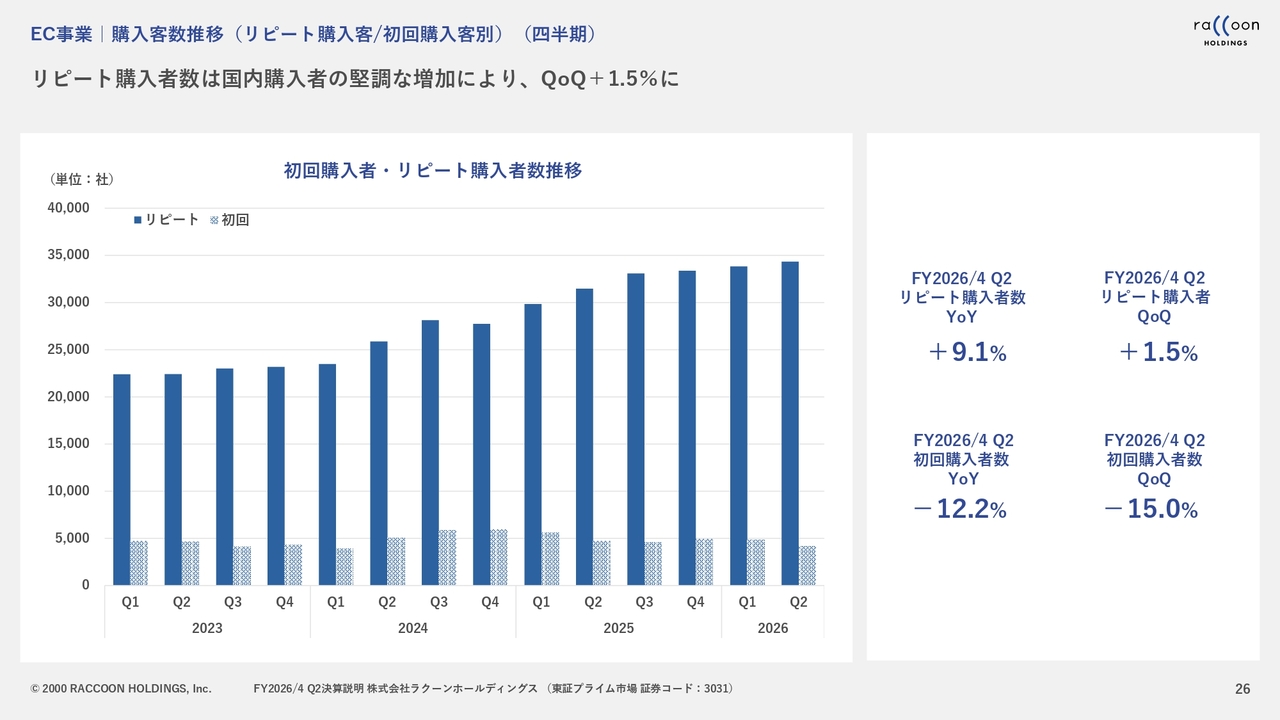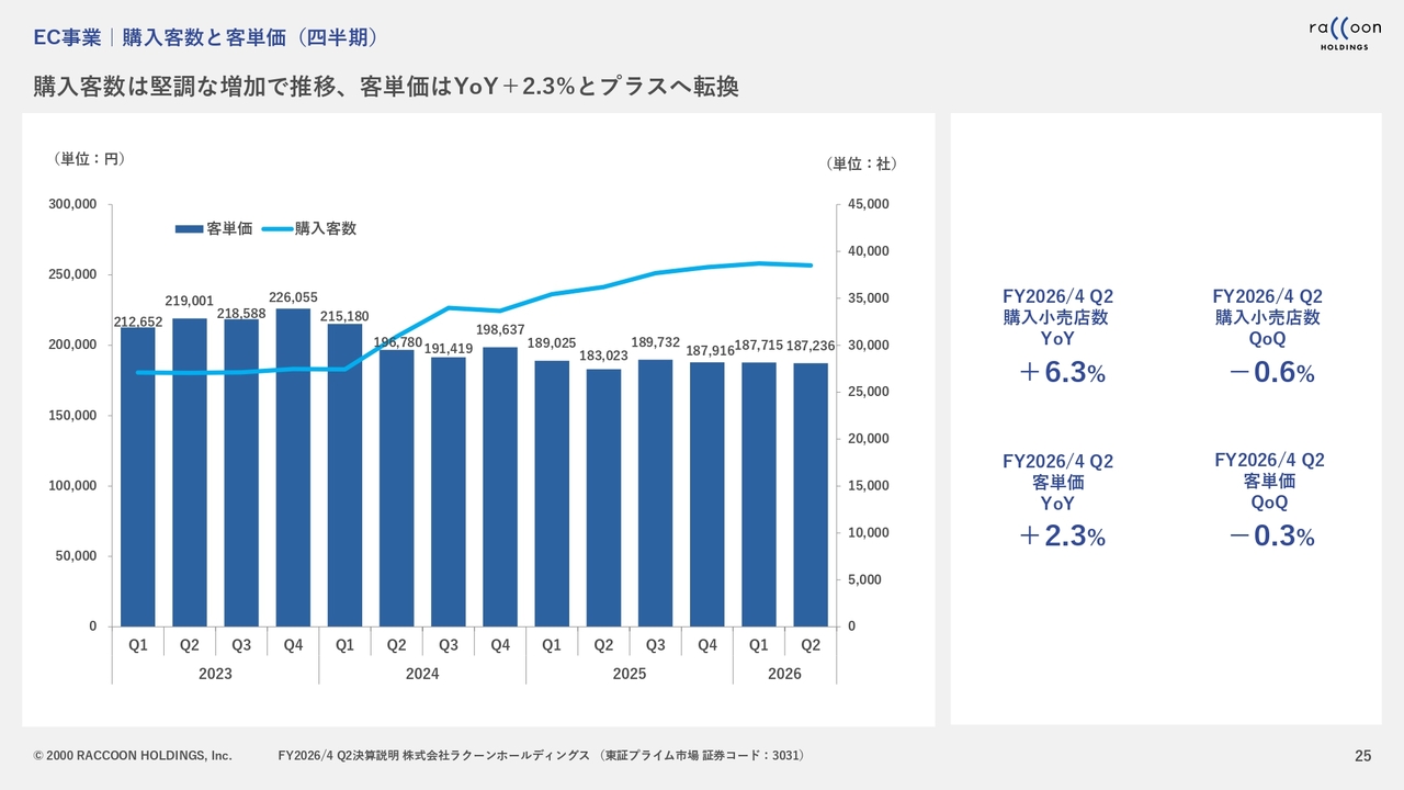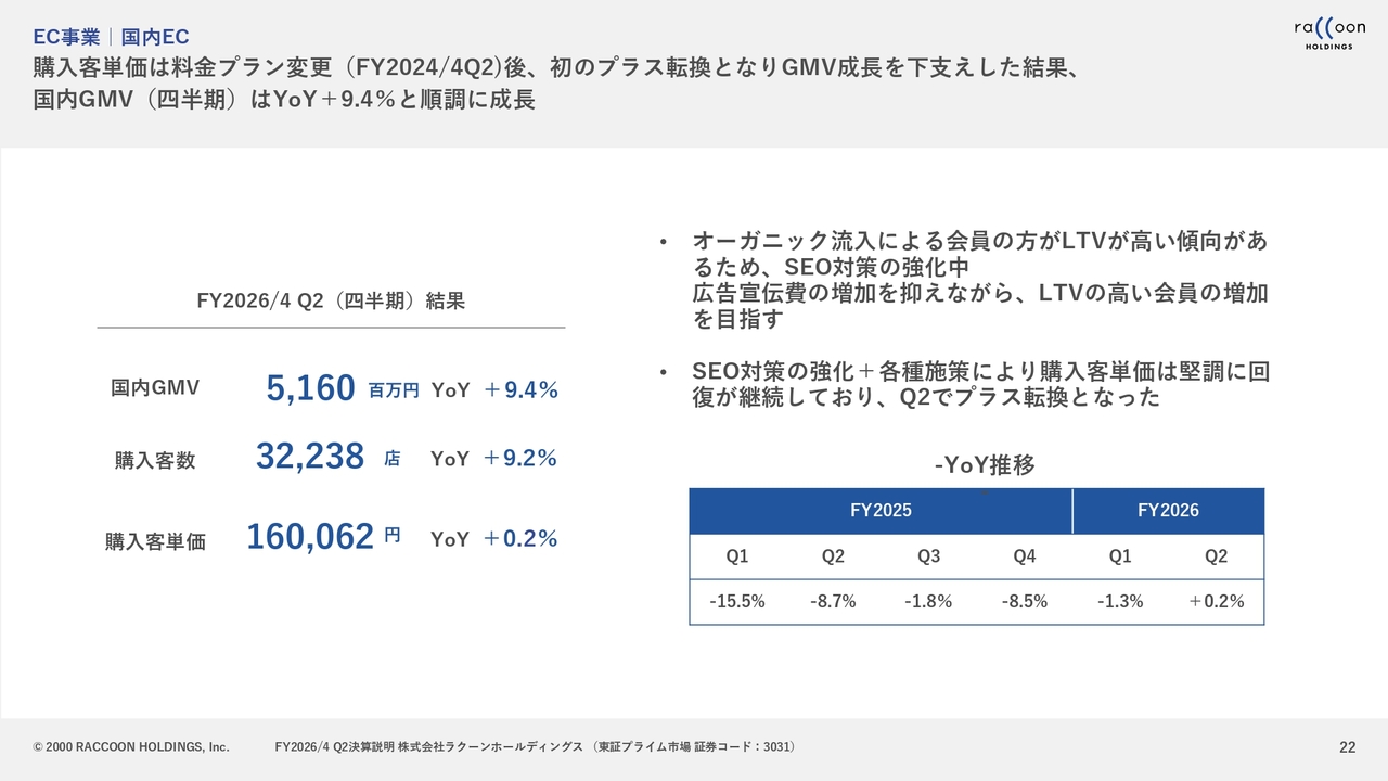 EC事業については、まず国内は非常に順調でした。後ほどご説明しますが、購入客単価は一昨年の料金体系の変更以降、下がり続けていましたが、ここ数四半期で底打ちし、今回ようやくプラス転換しました。この点が第2四半期における大きなポイントです。