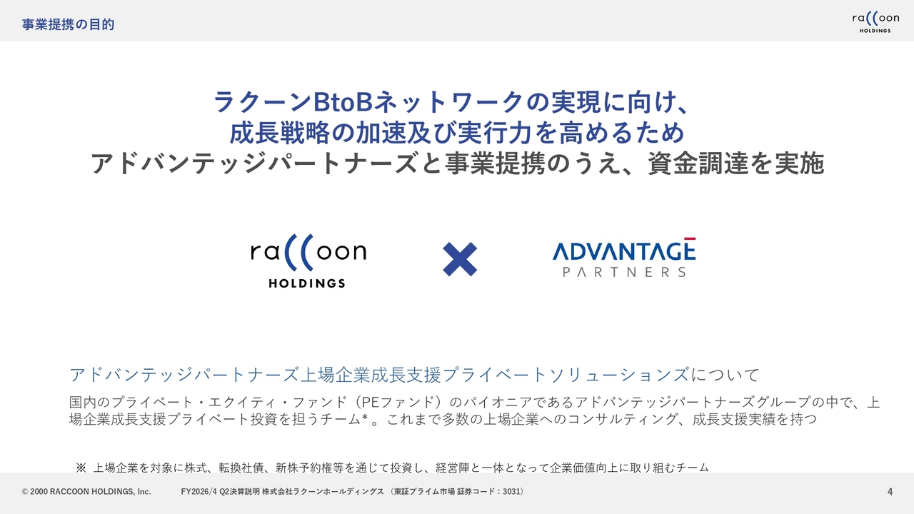 【QAあり】ラクーンHD、「BtoBネットワーク構想」早期実現に向け邁進 アドバンテッジパートナーズとの事業提携・資金調達を決定