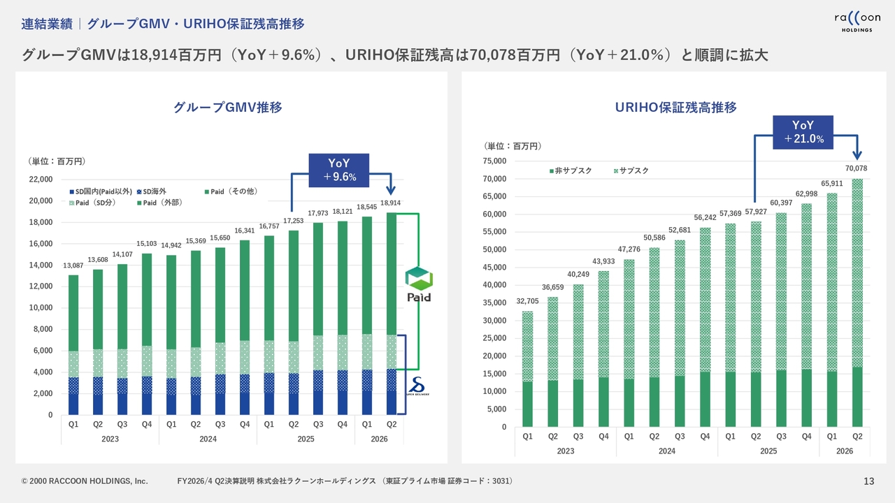 グループGMVと「URIHO」の保証残高については、スライドのとおりです。グループGMVは順調に堅調に伸びています。「URIHO」の保証残高は、第2四半期に大きく伸ばすことができました。