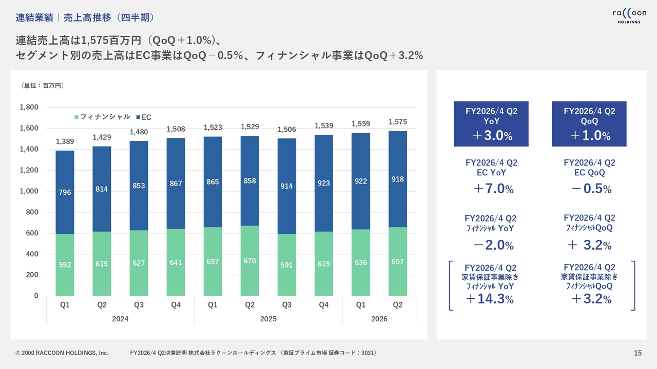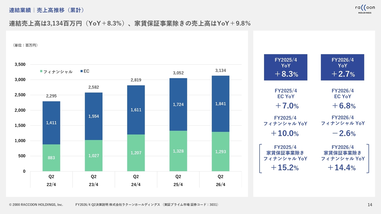 売上高の推移についてです。第2四半期までの半年間の横並びの部分については、スライドに記載したとおりです。フィナンシャル事業は若干減少しましたが、EC事業は順調に増加しています。家賃保証事業を除き、YoYでプラス9.8パーセントとなりました。