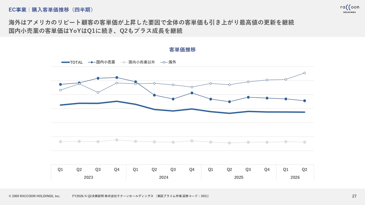 購入客単価推移については、スライドで見て取れるように、購入客単価は海外が牽引しており、第2四半期で大幅に伸びています。