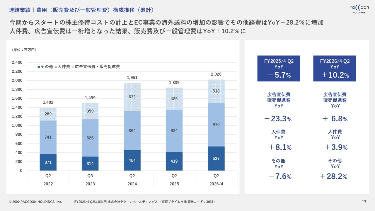 販管費は、第2四半期の決算で減益となった主な要因です。売上総利益までは非常に順調でしたが、コスト面が若干足を引っ張ったかたちとなりました。送料と株主優待については、スライドのグラフで一番色の濃い「その他」に該当します。