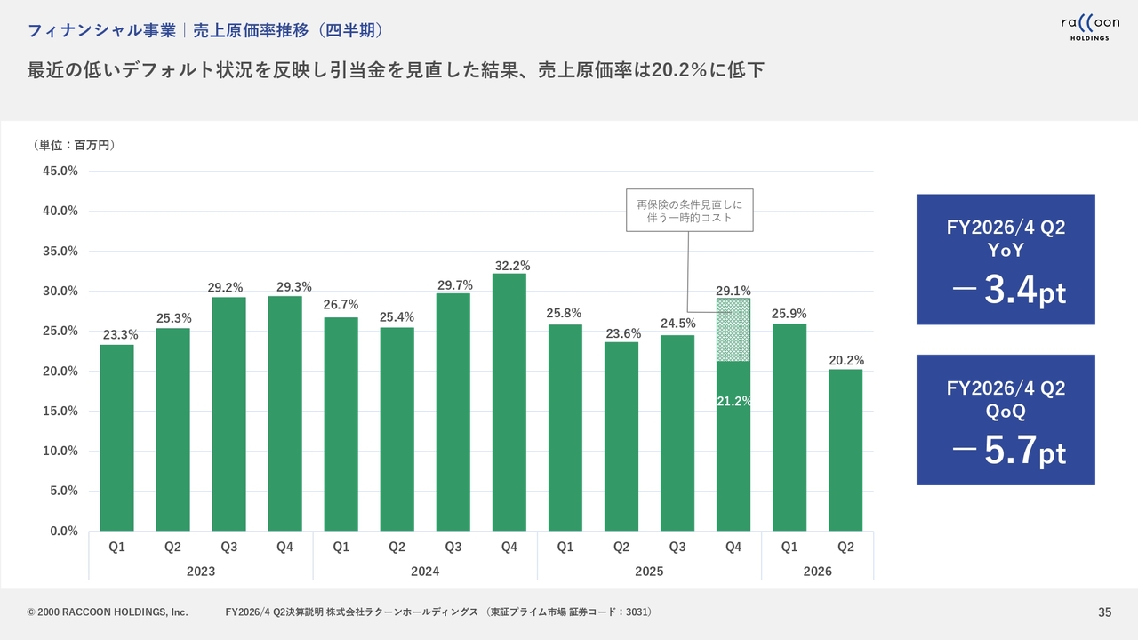 売上原価率推移についてです。デフォルトに関しては先ほどお話ししたとおり、通常の平均値は25パーセント程度ですが、第2四半期については引当率の見直しもあり、売上原価率は20.2パーセントと非常に低い水準となりました。