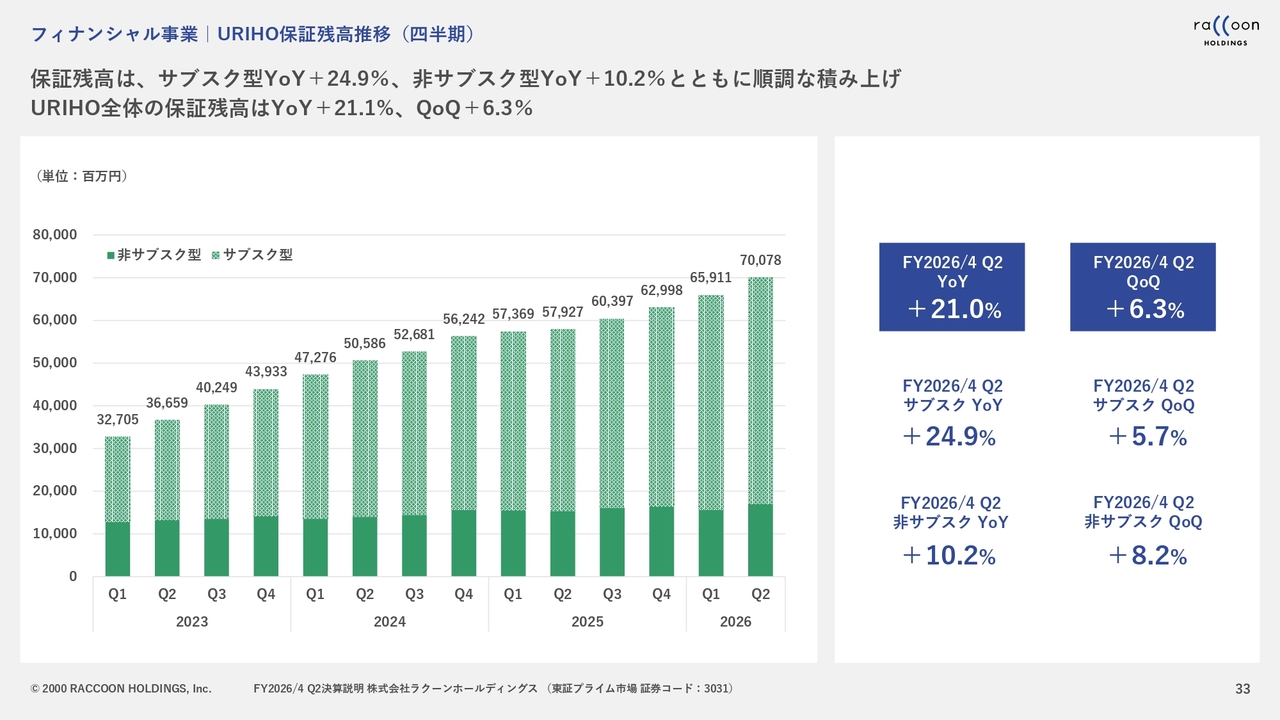 「URIHO」保証残高推移です。スライドにも記載されているとおり、保証残高の伸びが大きくなっています。サブスクの部分は引き続き大きく伸びていますが、特に非サブスクの部分は第2四半期で伸び率が10パーセントと高くなり、底上げ効果を果たしたと考えています。