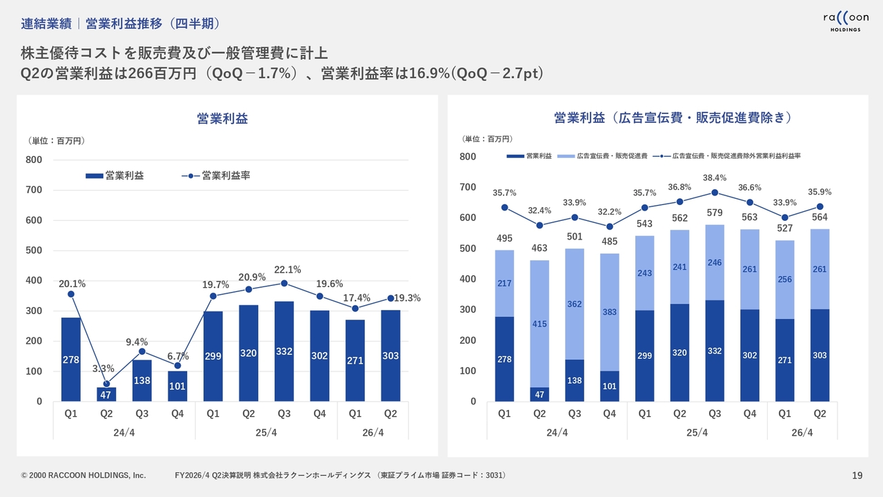 今期から株主優待を開始し、4,600万円のコストが発生しており、昨年は株主優待がなかったため、その分を調整すると営業利益はほぼ横ばいです。加えて、送料に関して第1四半期と第2四半期に5,000万円のコストが発生したため、YoYプラス0.1パーセントが実質的な結果です。