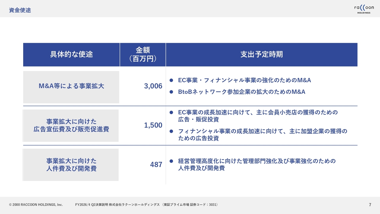 資金の具体的な使途についてです。M&Aなどによる事業拡大に約30億円を投じます。これは、EC事業及びフィナンシャル事業の強化を目的としたM&Aです。BtoBのネットワークへの参加企業、つまり先ほどお伝えした50万社のお客さまに対し、さまざまなサービスを提供できる可能性のある会社が対象となります。