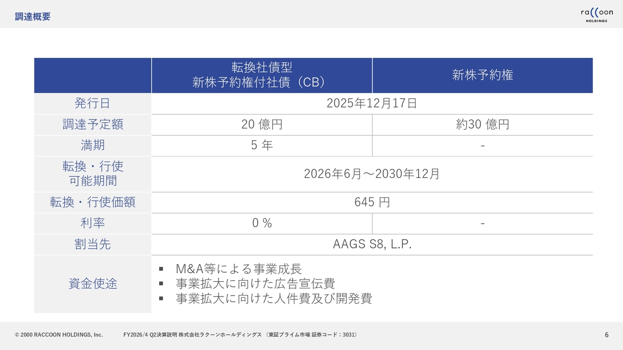 小方:調達内容の詳細としては、転換社債型新株予約権付社債(CB)として20億円、新株予約権として約30億円です。CBの満期は5年となっています。