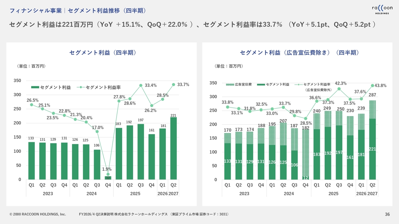 フィナンシャル事業のセグメント利益についてです。売上は想定を若干下回ったものの、2桁成長を遂げました。また、原価が低かったことから、利益ベースでは過去最高のセグメント利益となり、第2四半期は2億2,100万円の利益を達成しています。さらに、広告宣伝費を除き、2億8,700万円と過去最高の利益を計上しました。