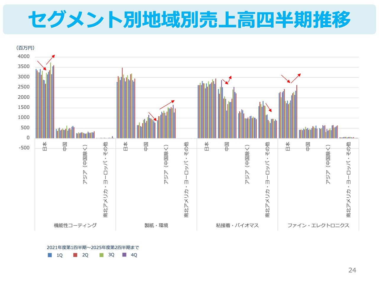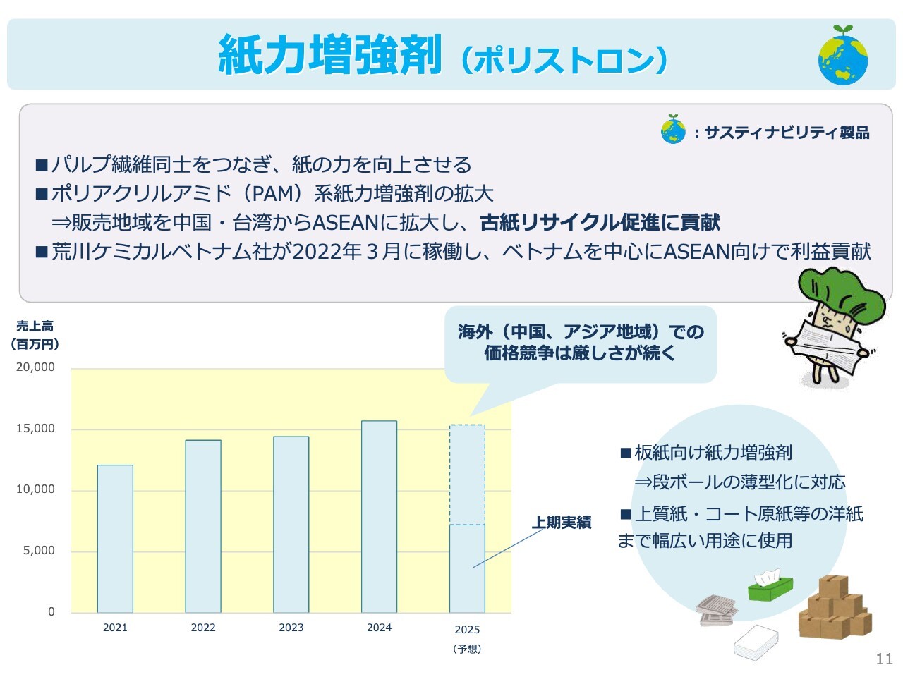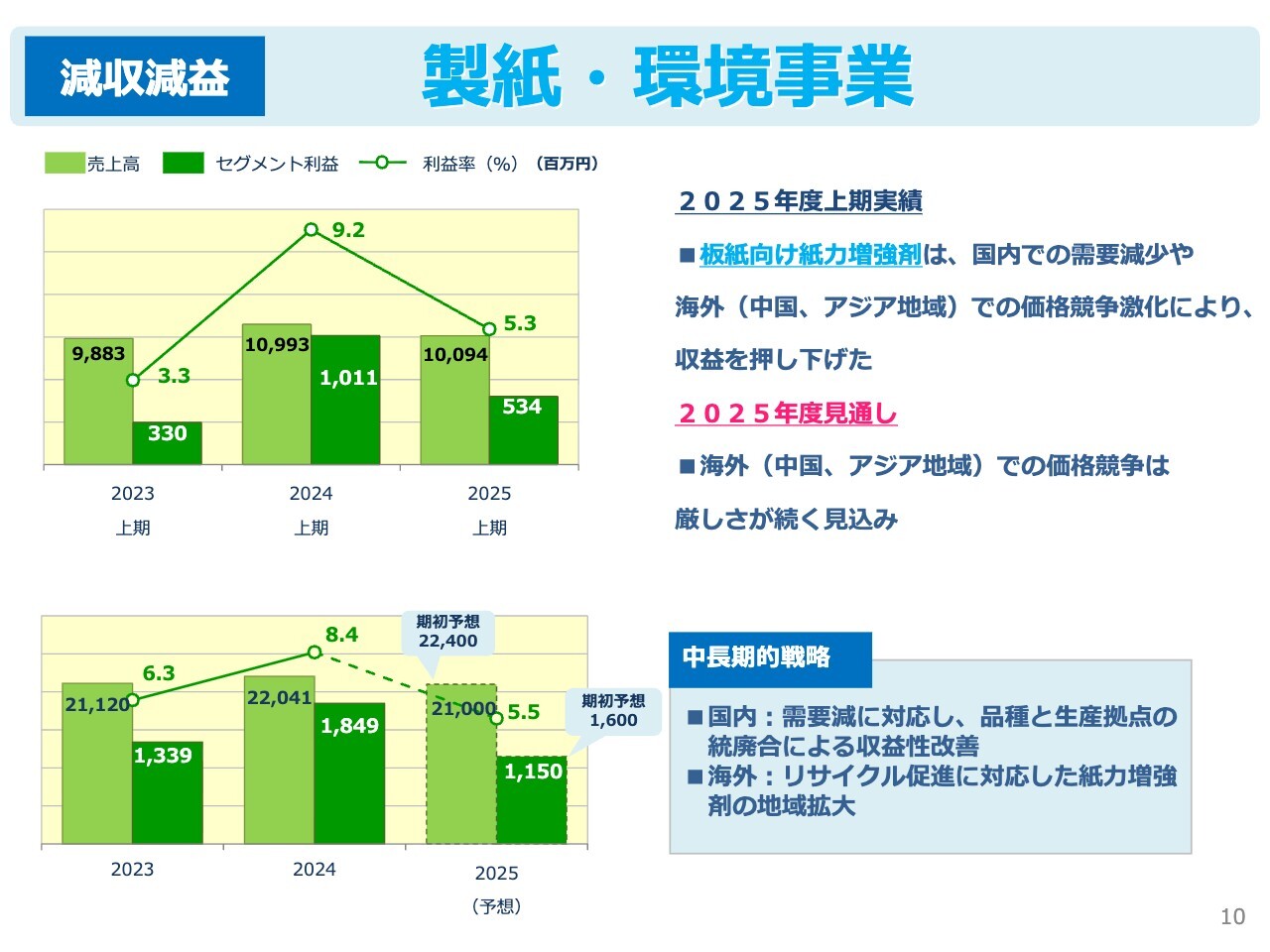 当事業の中長期的な戦略については、国内におけるサイズ剤事業は、需要減少に対応し、生産拠点と品種の統廃合を2025年3月末に完了しました。今後、収益性の改善効果が表れると見込んでおり、さらに抜本的なコスト改善策にも取り組んでいきます。