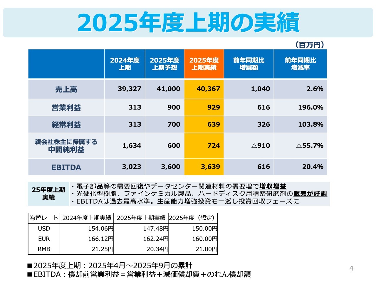 はじめに、決算概要と今期予想についてご説明します。2025年度上期の業績については、光硬化型樹脂、ファインケミカル製品、ハードディスク用精密研磨剤の販売が好調だったことから、連結売上高は403億6,700万円で、前年比2.6パーセントの増収となりました。