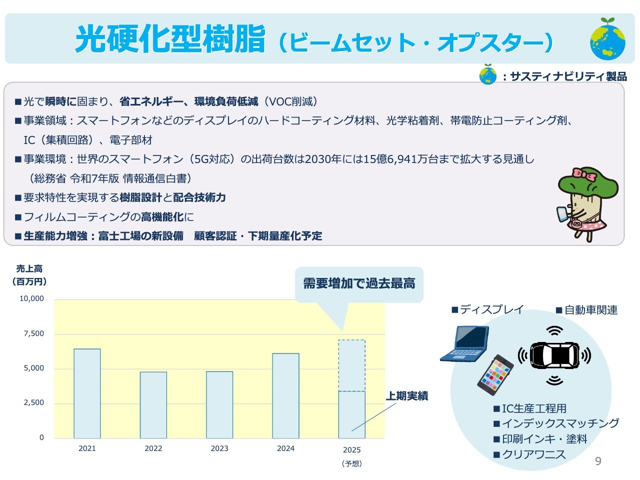 質問者:光硬化型樹脂についても非常に伸びているようです。スライド9ページの右下にいくつか用途が挙げられていますが、この中で特にどの用途が伸びているのか、また、来年度や再来年度に向けて、どの程度の成長が見込まれるのか教えてください。今回は増額もされているため、かなり上向いてきていると思います。その点についてもお願いします。