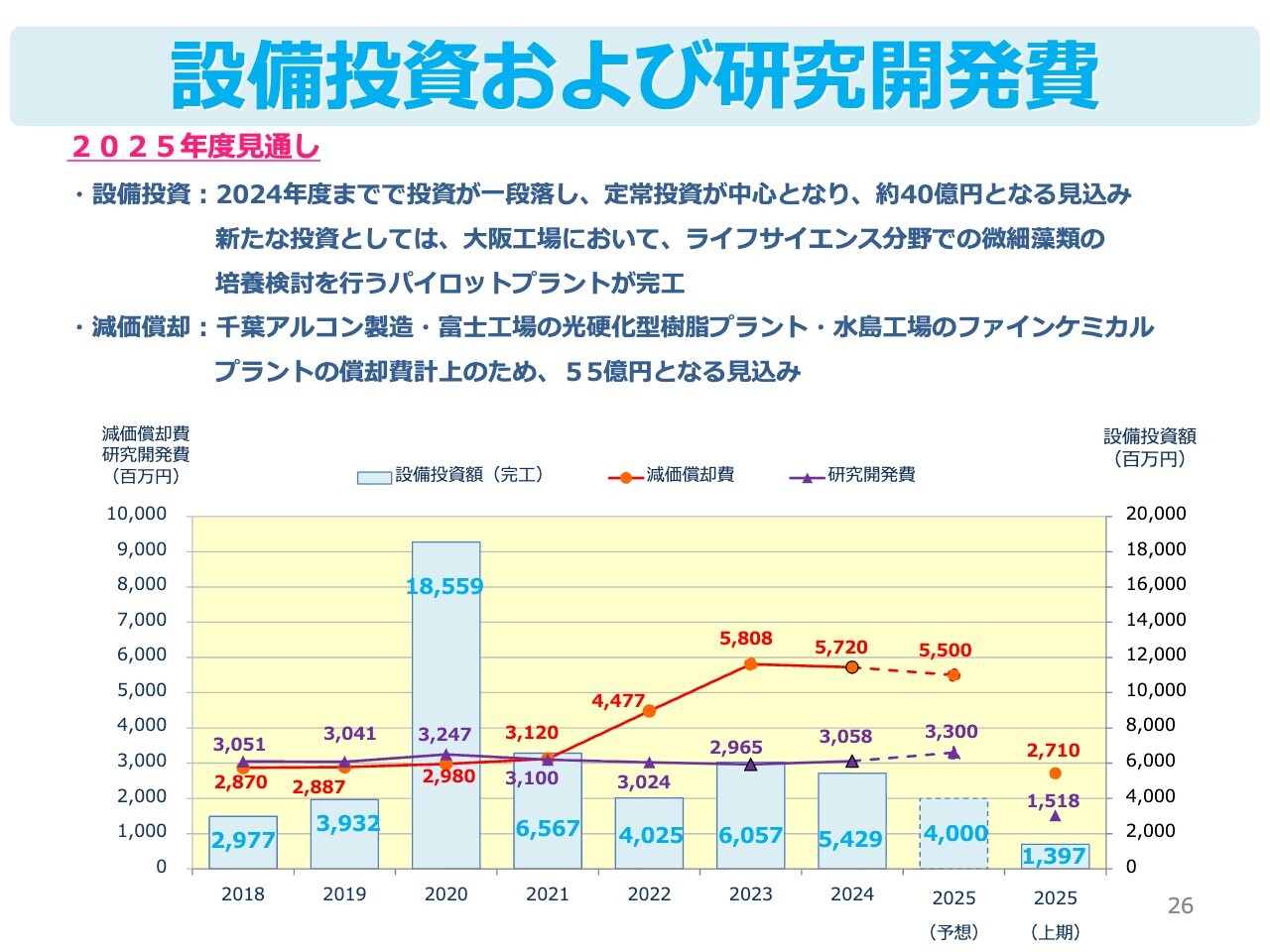 2025年度上半期の設備投資額は、完工ベースで13億9,700万円となり、前年比1億100万円の増加となりました。通期では「のばす」ミッションに位置づけた事業への投資が一段落したことで、定常投資が中心となり、約40億円となる予定です。新たな投資としては、大阪工場においてライフサイエンス分野での事業創出に向けた微細藻類のパイロットプラントが完工しました。