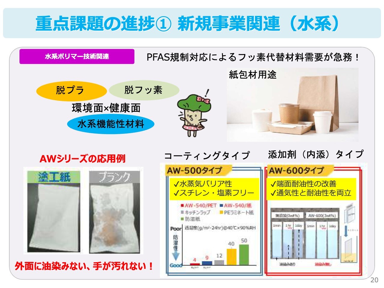 新規事業関連についてご説明します。脱プラスチックの流れを受けて、プラスチック容器を紙容器に代替する動きが広がっていますが、その際、紙に耐油性や水蒸気バリア性を付与することが求められます。