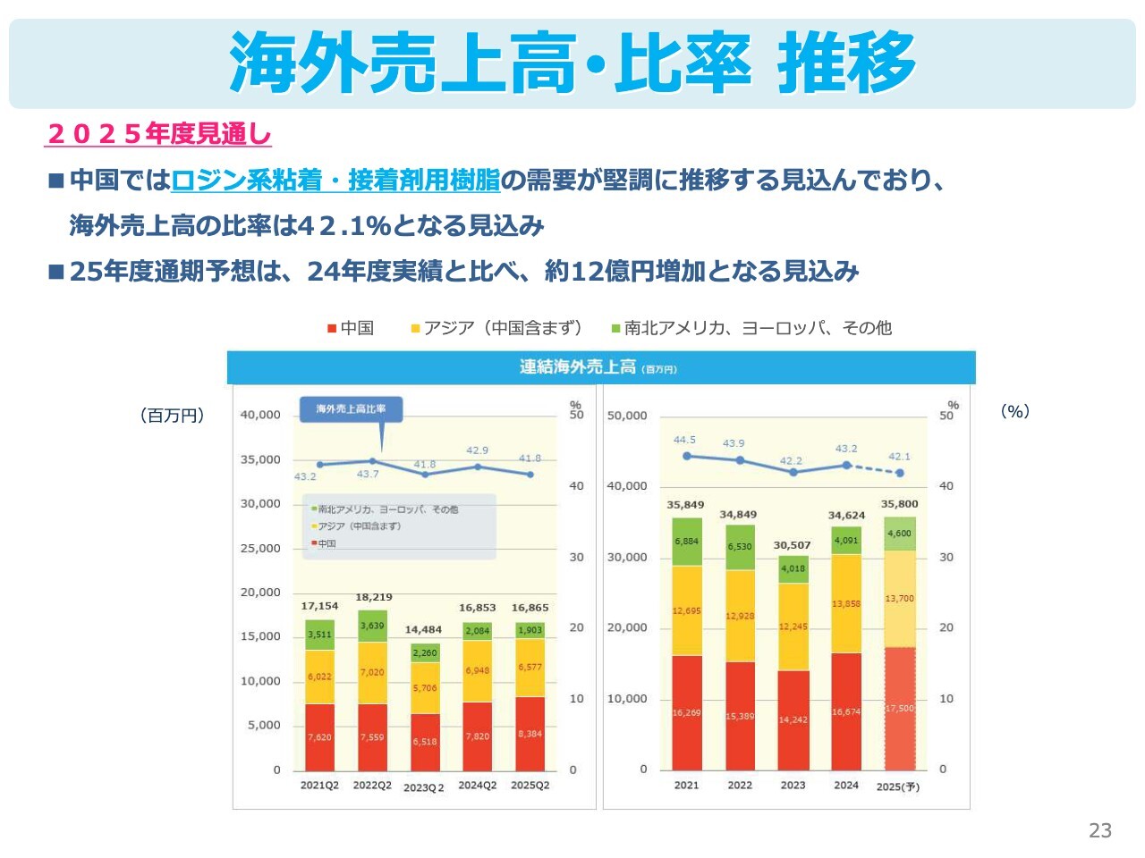 海外売上高についてご説明します。上期の海外売上高は前年とほぼ同じ168億6,500万円となりました。通期の見通しについては、中国におけるロジン系粘着・接着剤用樹脂の需要が堅調に推移すると見込んでおり、前年実績から約12億円増加して358億円、海外売上高比率は42.1パーセントとなる見込みです。