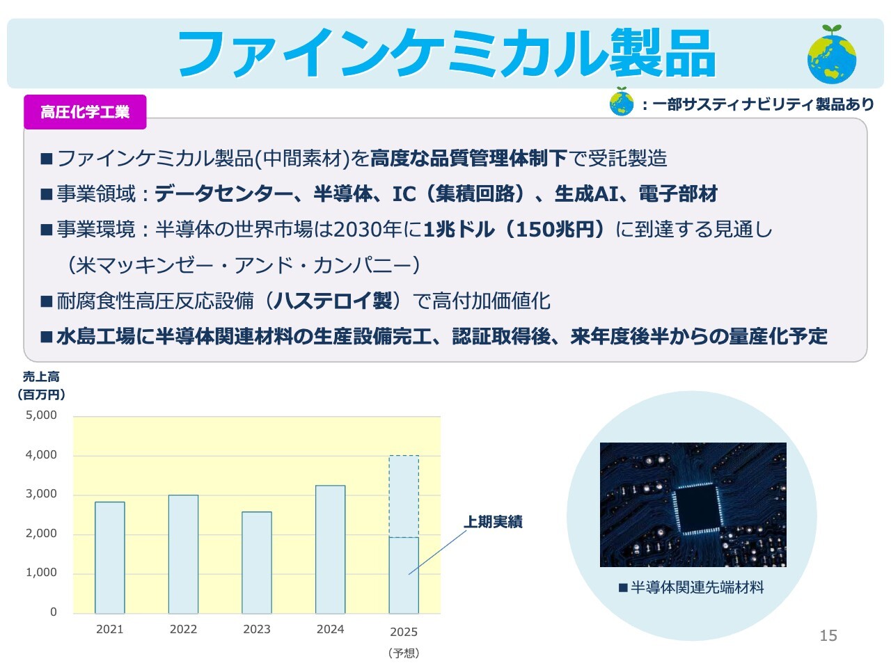 また、2024年12月に完工した水島工場のファインケミカル製品用新プラントでは、5月から試作および認証取得の段階に入っており、来年度後半から量産化を開始する見込みです。