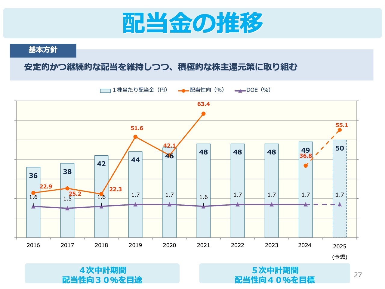 第5次中期経営計画期間中においては、成長戦略を実現し利益を拡大することで、配当額の増加と配当性向40パーセントを目標としています。今期の配当金は期初の予想から変更はなく、中間配当は25円、期末配当予想も同様に25円で、年間配当は50円を予定しています。