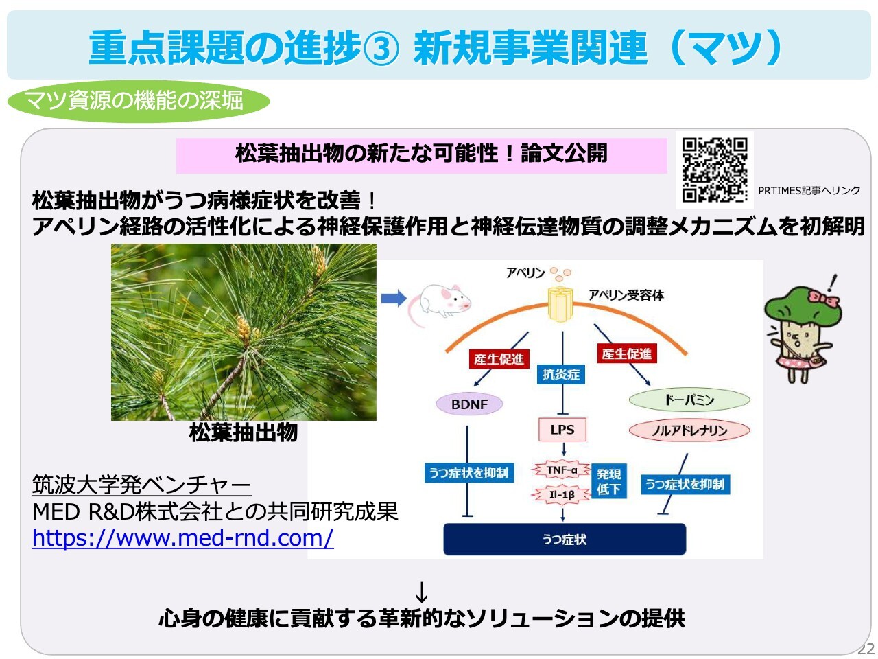 新規事業関連の最後として、筑波大学発のベンチャーであるMED R&D社との共同研究についてご紹介します。マウス実験により、松葉抽出物がうつ病の症状を改善する可能性があるという知見は以前にもお伝えしましたが、このたびそのメカニズムを初めて解明し、論文を公開しました。