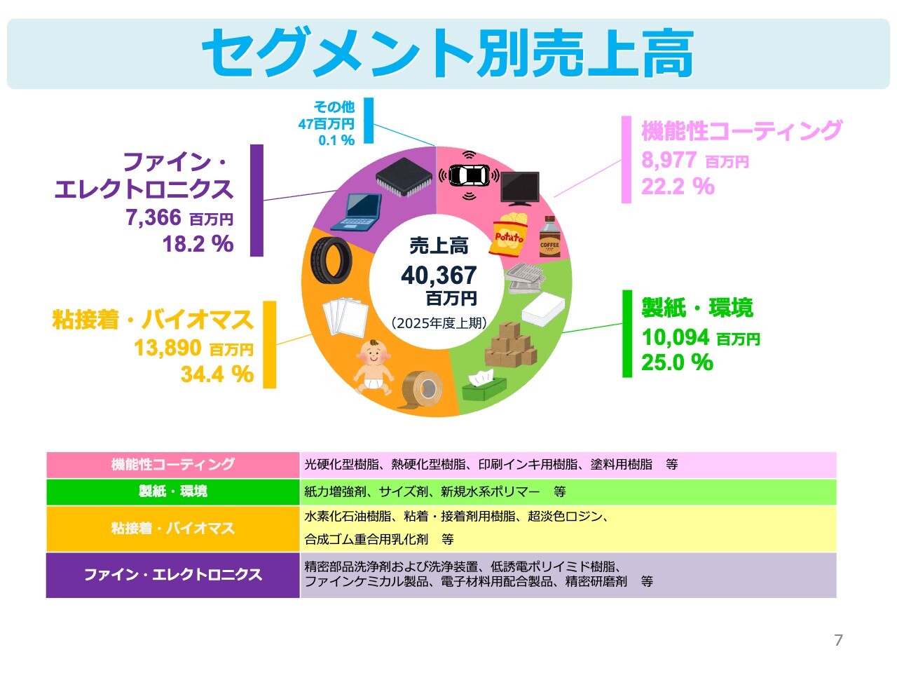 セグメント別に見ると、機能性コーティング事業では、ディスプレイ関連分野での光硬化型樹脂の販売が着実に増加しています。製紙・環境事業では、需給バランスの変化による価格の低下とともに、販売数量も減少しています。粘接着・バイオマス事業では、ロジン系粘着・接着剤用樹脂の販売が堅調です。ファイン・エレクトロニクス事業では、電子材料用配合製品や低誘電ポリイミド樹脂「PIAD」の販売が増加傾向にあります。