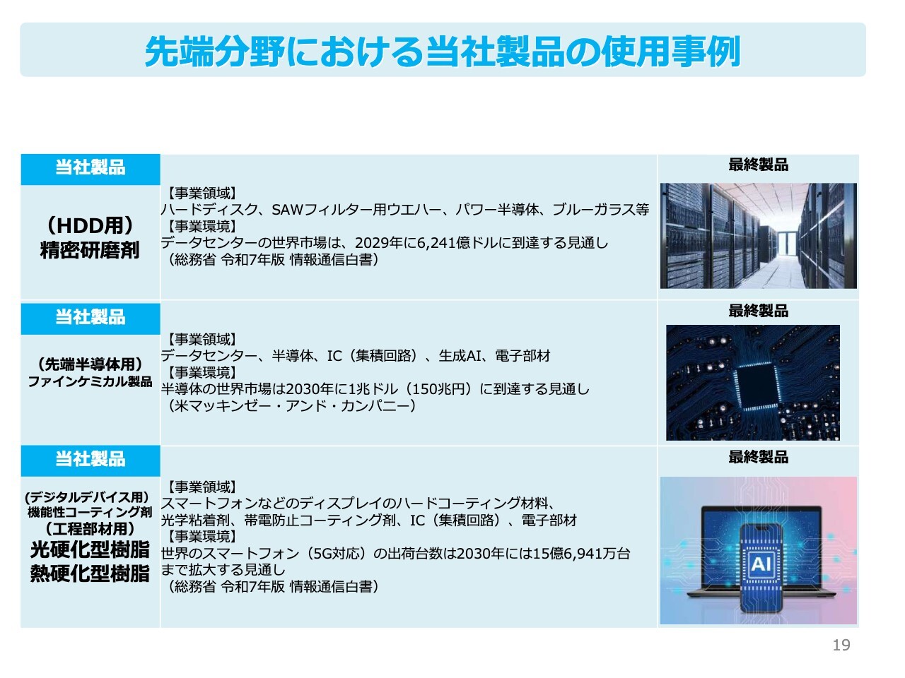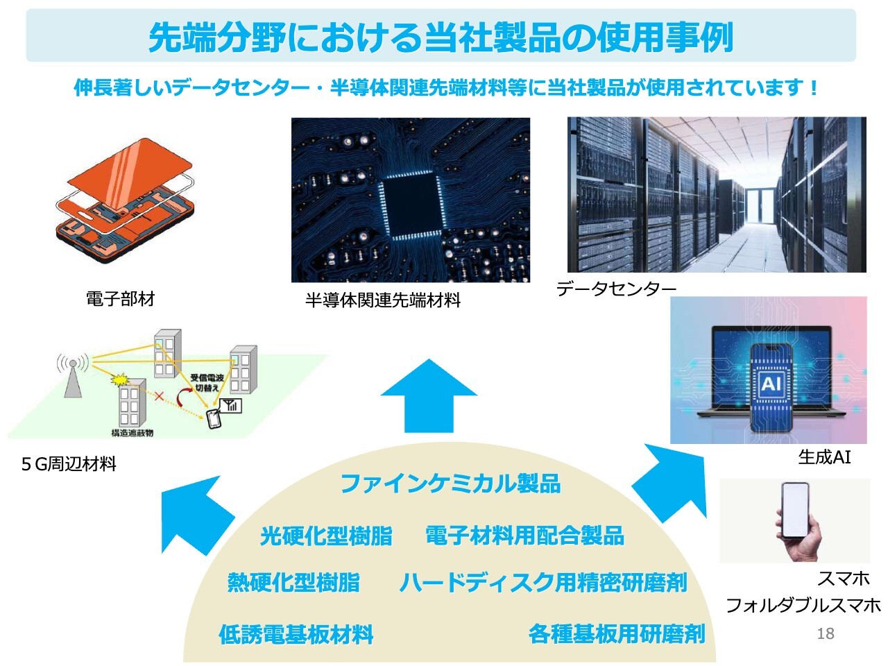 データセンターや半導体関連の先端材料に使用されている当社製品には、光硬化型樹脂や熱硬化型樹脂、ファインケミカル製品、ハードディスク用精密研磨剤など、多くのものがあります。また、フォルダブルスマホや5G周辺材料といった生成AI関連市場でも、当社製品が使用されています。