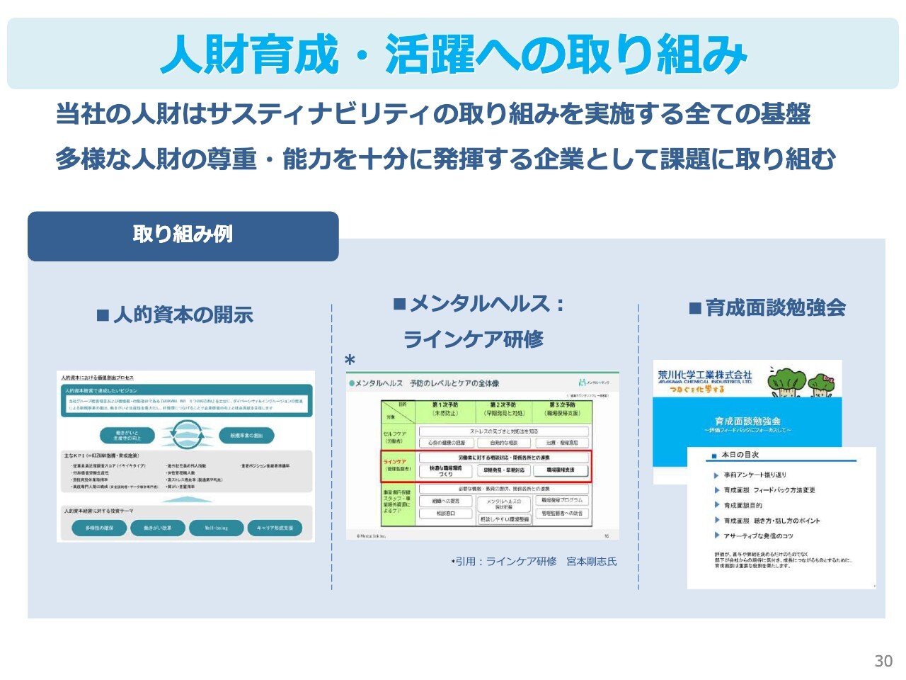最後に、荒川化学グループのサスティナビリティへの取り組みについてご紹介します。当社は、経営理念に基づき、持続可能な成長の実現を目指して社会課題に対応するため、さまざまな取り組みを進めています。