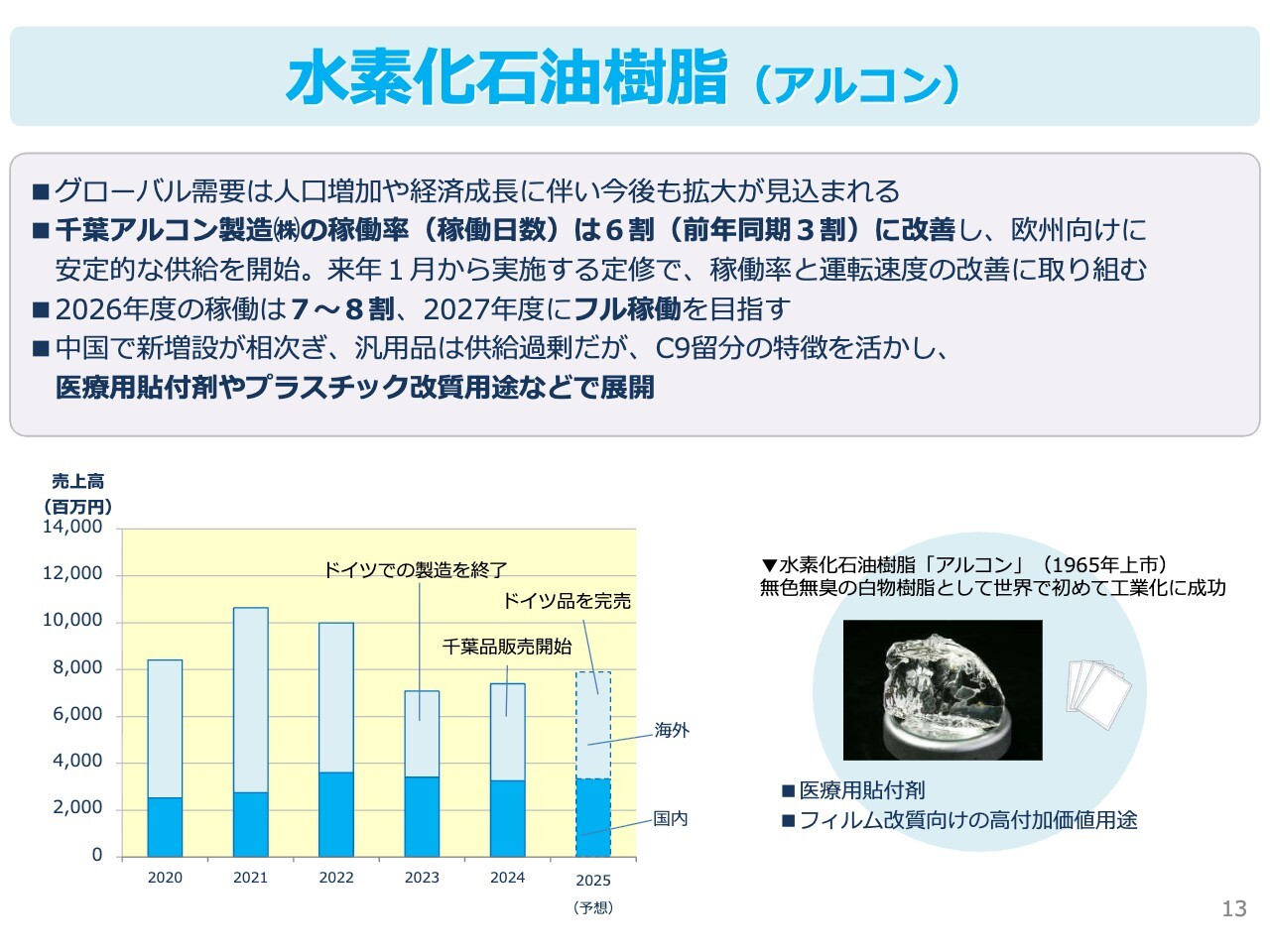 水素化石油樹脂「アルコン」についてです。上期の売上高は35億円となりました。グローバル需要は人口増加や経済成長に伴い、今後も拡大が予想されますが、中国で生産される汎用品の供給過剰により、価格競争に巻き込まれる状況にあります。