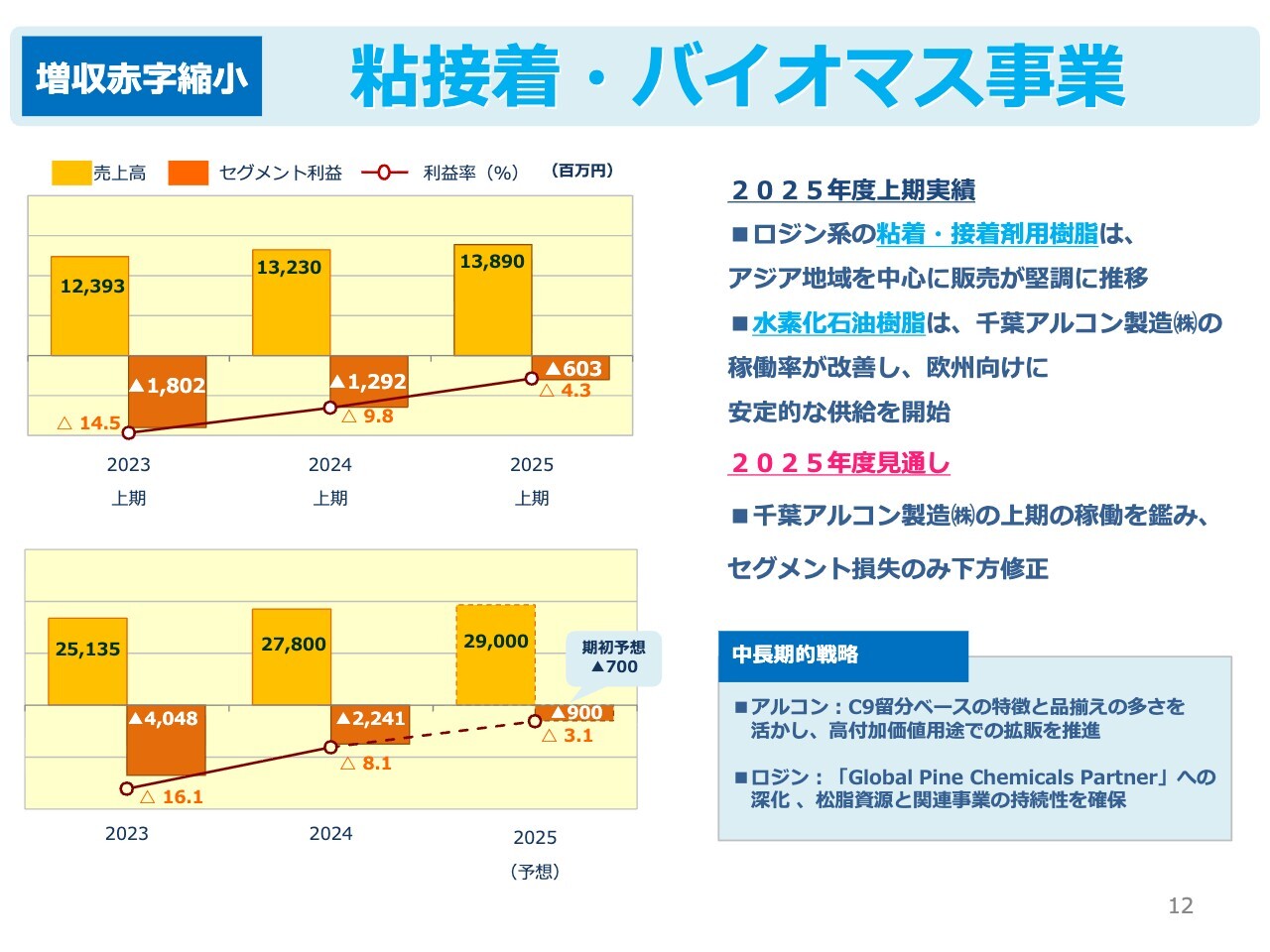 通期予想では、ロジン系粘着・接着剤用樹脂の販売は引き続き堅調ですが、千葉アルコン製造の上期の稼働状況を踏まえ、売上高は前回予想から変更なく290億円、セグメント損失は当初予想の7億円から2億円増加し、9億円に修正しています。