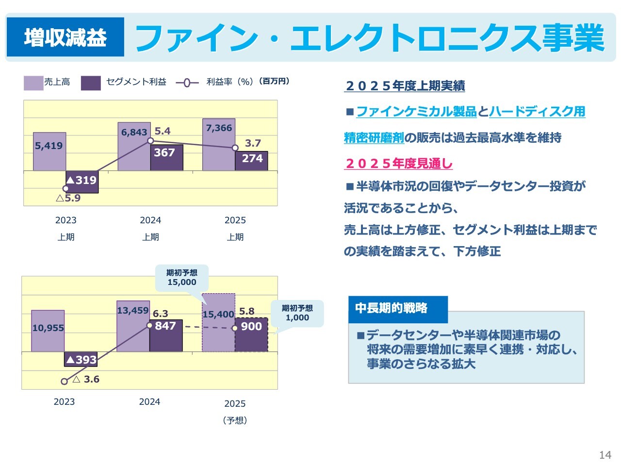データセンター向けハードディスク用精密研磨剤や、半導体関連先端材料のファインケミカル製品の販売が増加しました。一方で、精密研磨剤や電子材料用配合製品については価格改定を順次進めているものの、コスト増が売値に先行して上がるかたちとなり、利益を押し下げる要因となっています。