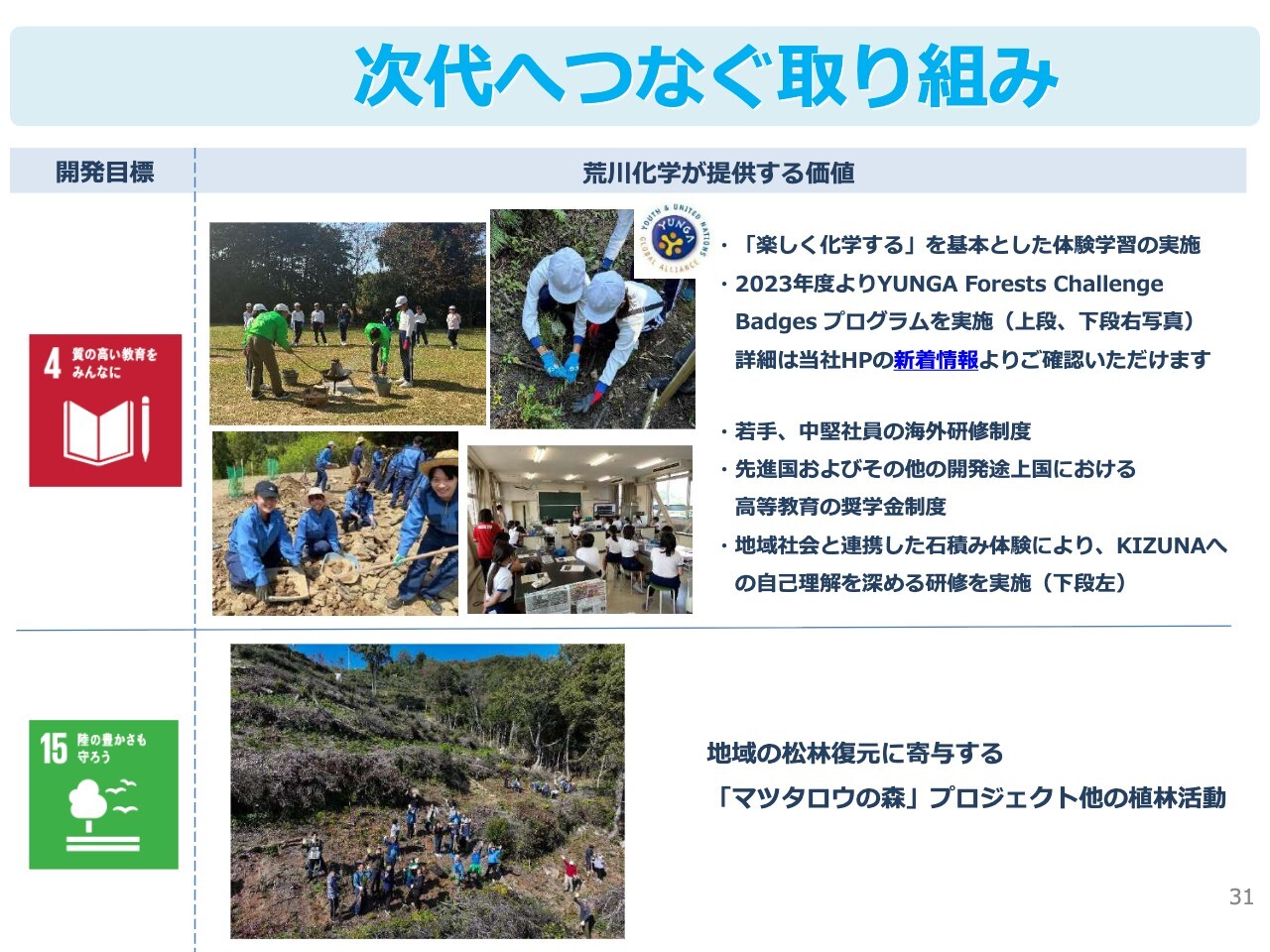 次世代へつなぐ取り組みについてです。2025年度は、当社が2016年から植林活動を行っている岡山県矢掛町での「マツタロウの森」を舞台に、2023年度から開始した「YUNGA Forests Challenge Badgeプログラム」を引き続き実施しました。今後も「楽しく化学する」を基本として、植林活動などを通じた体験学習を提供していきます。