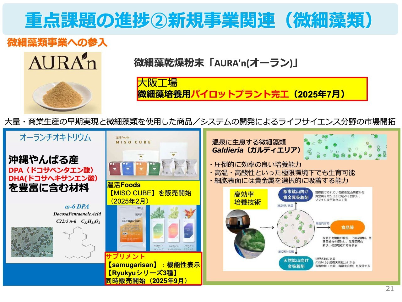 微細藻類事業についてご説明します。沖縄やんばる産の微細藻であるオーランチオキトリウムは、DPAやDHAを豊富に含むことから、高機能食品として注目されています。その乾燥粉末である「オーラン」を含む温活フードとして、フリーズドライ味噌汁「MISO CUBE」や、機能性表示食品のサプリメント「samugarisan」などをすでに販売しています。