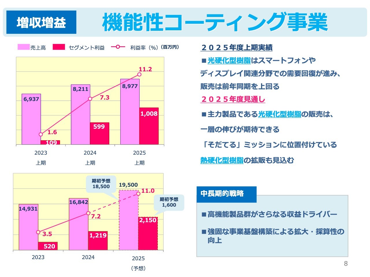 通期予想については、主力である光硬化型樹脂の販売がより一層伸びることが見込まれることから、売上高は前回予想の185億円から10億円増の195億円、セグメント利益は16億円から5億5,000万円増の21億5,000万円に修正しています。