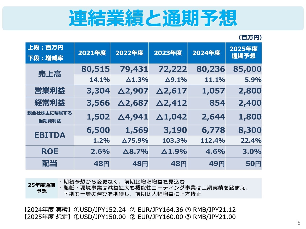 2025年度の通期予想については、前年比で増収増益を見込んでいます。5月14日に公表した前回予想から全体の数値に変更はありません。ただし、各セグメントの予想では、製紙・環境事業は前回予想から減益となる見込みである一方、機能性コーティング事業は前回予想から増益が見込まれるなど、上期の進捗と足元の状況を鑑み、予想数値を見直しています。