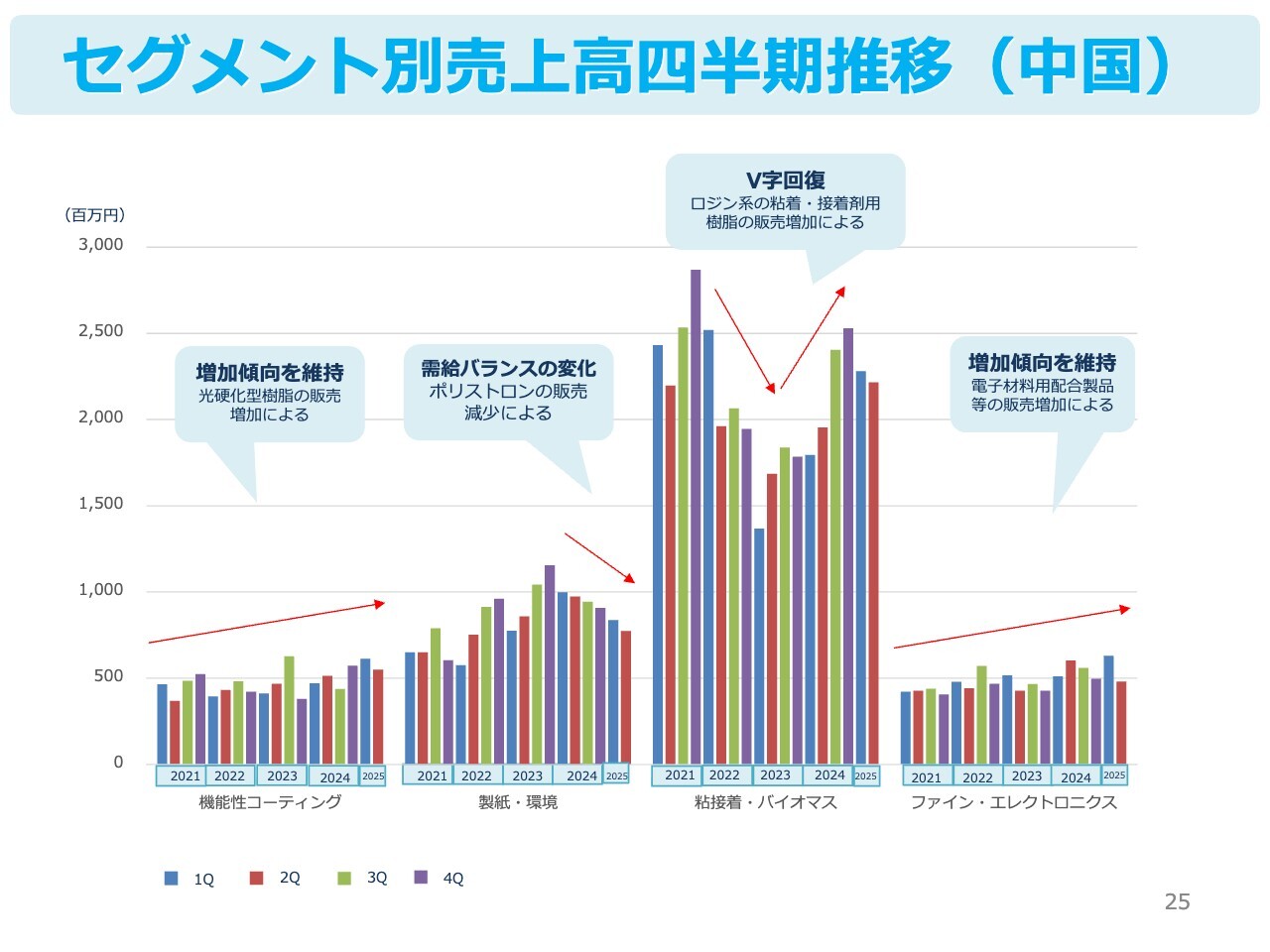 製紙・環境事業では、中国での売上が減少傾向にあるものの、アジアの他国でカバーしていることがわかります。粘接着・バイオマス事業においては、先ほどご説明したとおり、中国でのロジン系粘着・接着剤用樹脂が好調で、V字回復していることが確認できます。また、機能性コーティング事業およびファイン・エレクトロニクス事業でも、日本国内の売上高はV字回復傾向となっています。