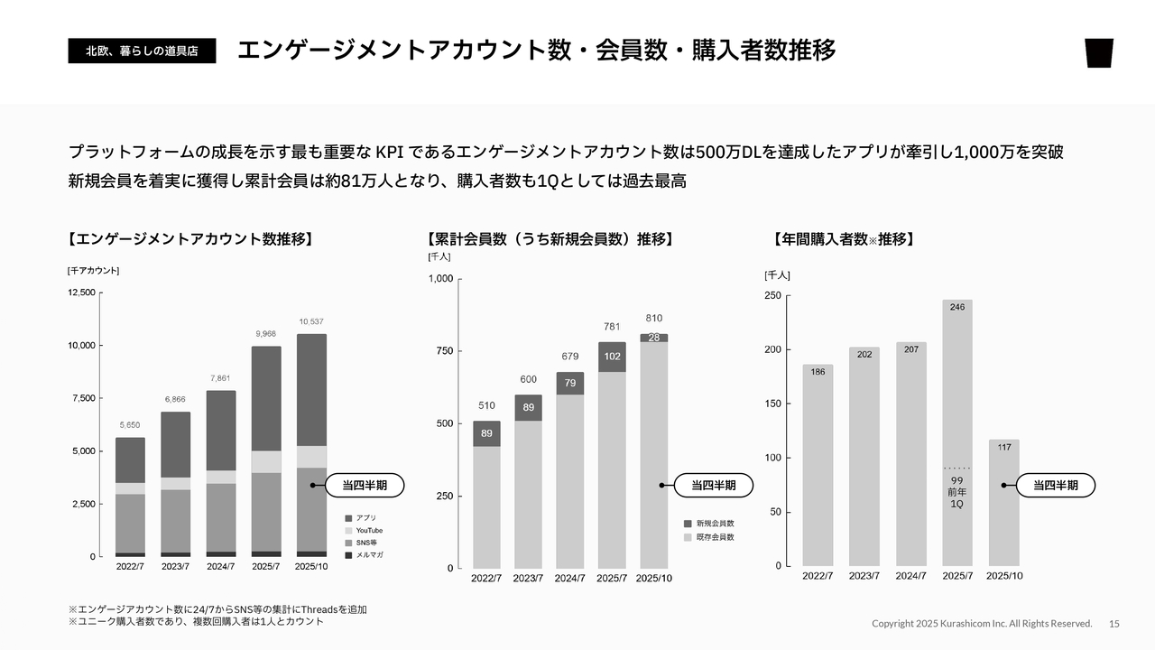 当社の重要なKPIである「エンゲージメントアカウント数」、エンゲージメントアカウントから新規会員になった方々がどのくらいアクティブに買い物をしているかを示す「年間購入者数」についてご説明します。