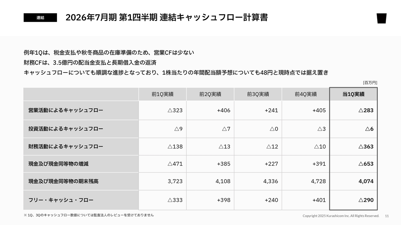 その結果、第1四半期トータルでは現金及び現金同等物が前四半期比で6億5,300万円のマイナスとなりました。フリー・キャッシュ・フローは2億9,000万円のマイナスです。