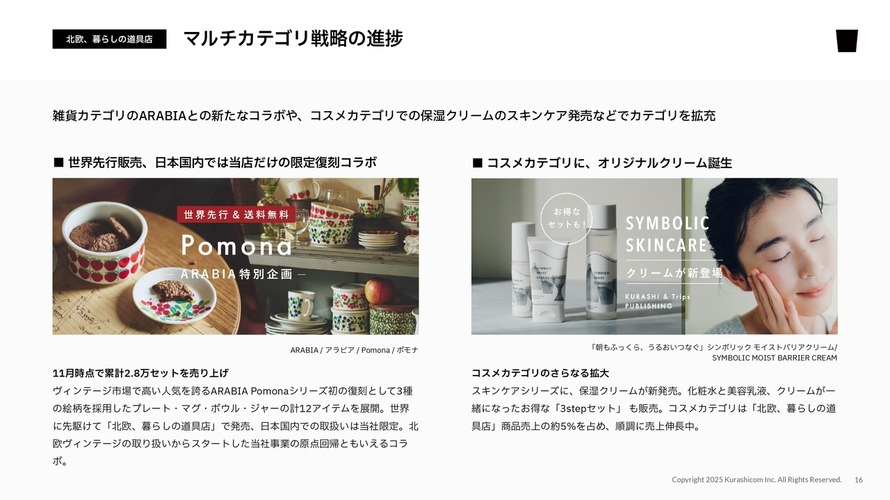 このようなスキンケアを中心としたコスメカテゴリも堅調に成長しており、「北欧、暮らしの道具店」の商品売上の約5パーセントを占めています。当社の売上利益をしっかり支える一部になりつつあると考えています。