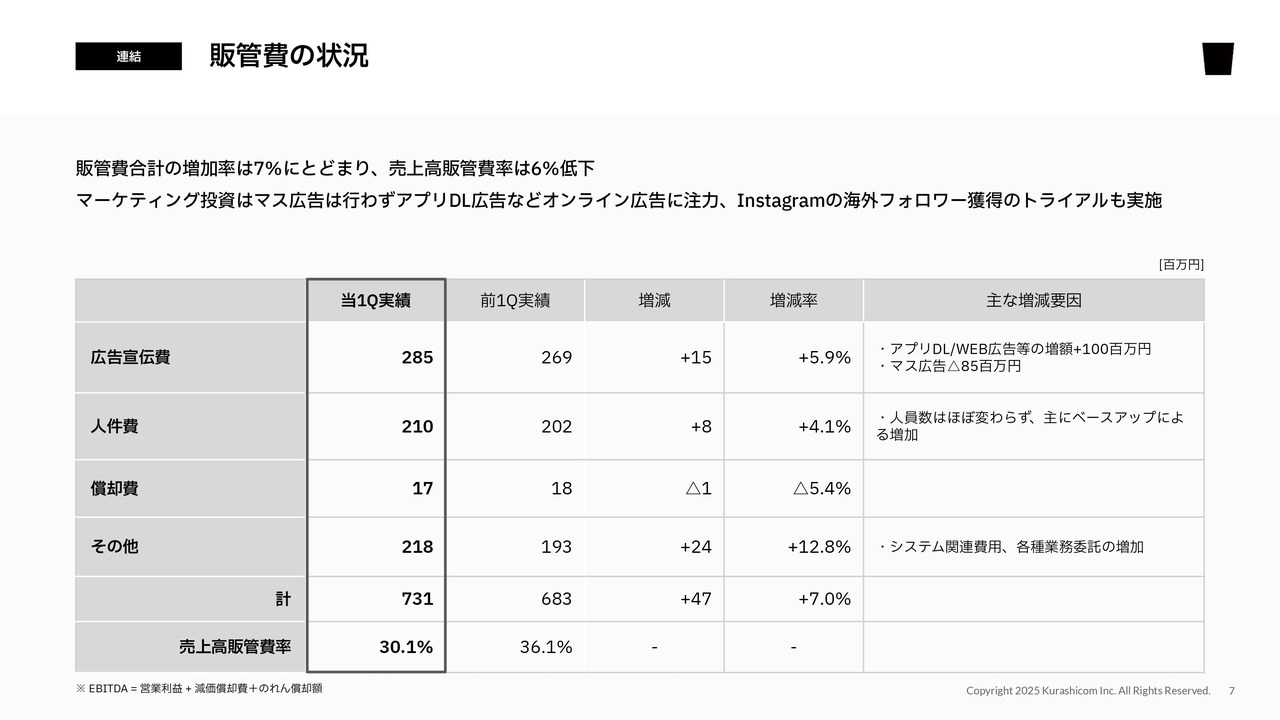 また、当第1四半期では、2億8,500万円の広告宣伝費のうち、将来に向けた取り組みとして海外の「Instagram」フォロワー獲得を目的としたトライアルも実施しています。これを含めて、広告宣伝費は売上高に対して12パーセント弱の比率でコントロールしています。