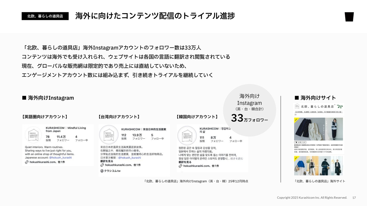 成長戦略のもう1つの軸についてもご説明します。エンゲージメントアカウントを獲得し、お客さまに幅広くリーチすることで接点を確保する取り組みとして、今四半期は海外向けの「Instagram」アカウントの運営について実験を行いました。