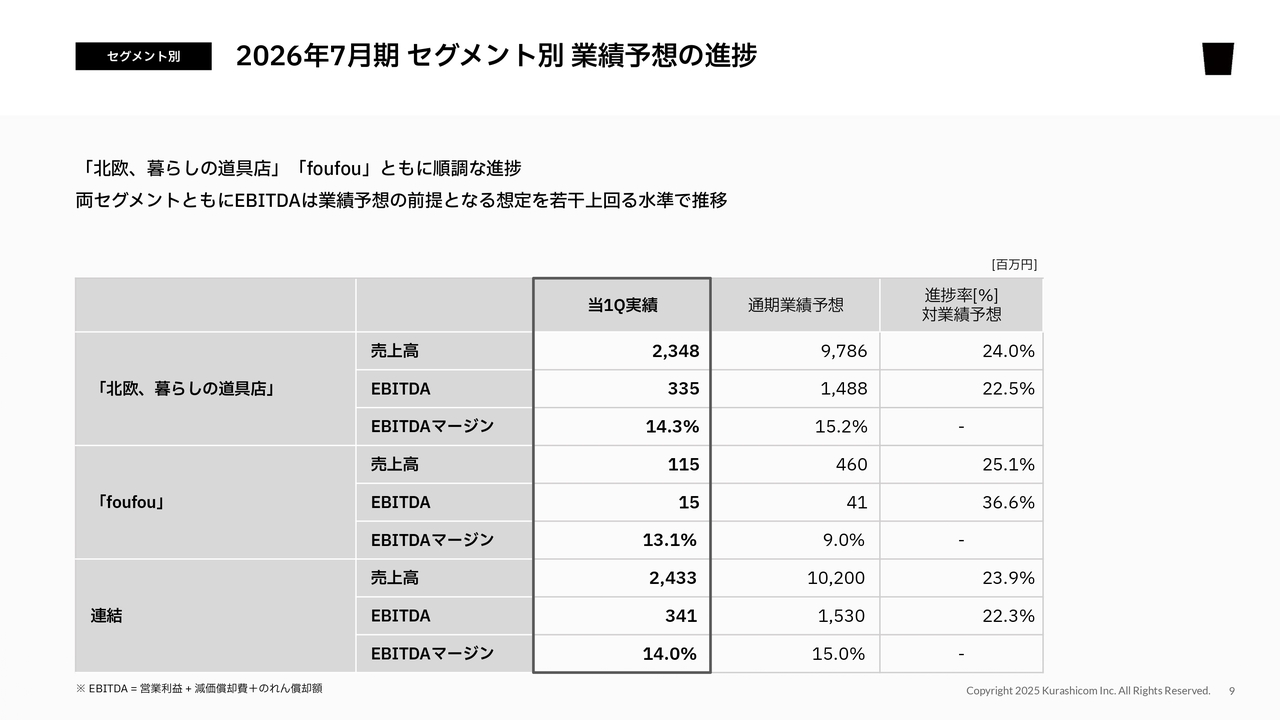 「北欧、暮らしの道具店」は売上高の進捗率が24パーセント、EBITDAが22.5パーセントですが、先ほどご説明した季節性を考慮すると順調な進捗だとご理解ください。