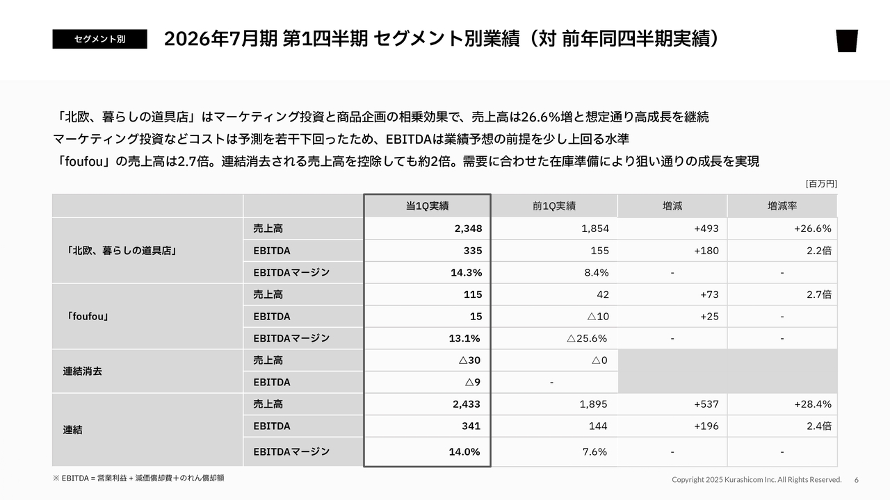 また、当第1四半期においてはグループ間取引があり、連結消去欄を設けています。具体的には、今年10月時点で「foufou」から「北欧、暮らしの道具店」がコラボ商品を仕入れ、11月に「北欧、暮らしの道具店」で発売する取り組みを行いました。そのグループ間での取引を消去しています。