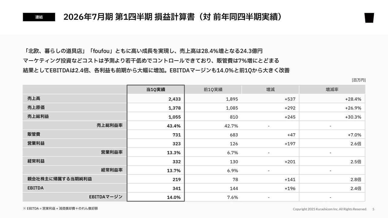 連結の損益計算書では、「北欧、暮らしの道具店」「foufou」ともに高い成長を実現できました。売上高は前年同四半期比28.4パーセント増の24億3,300万円となりました。