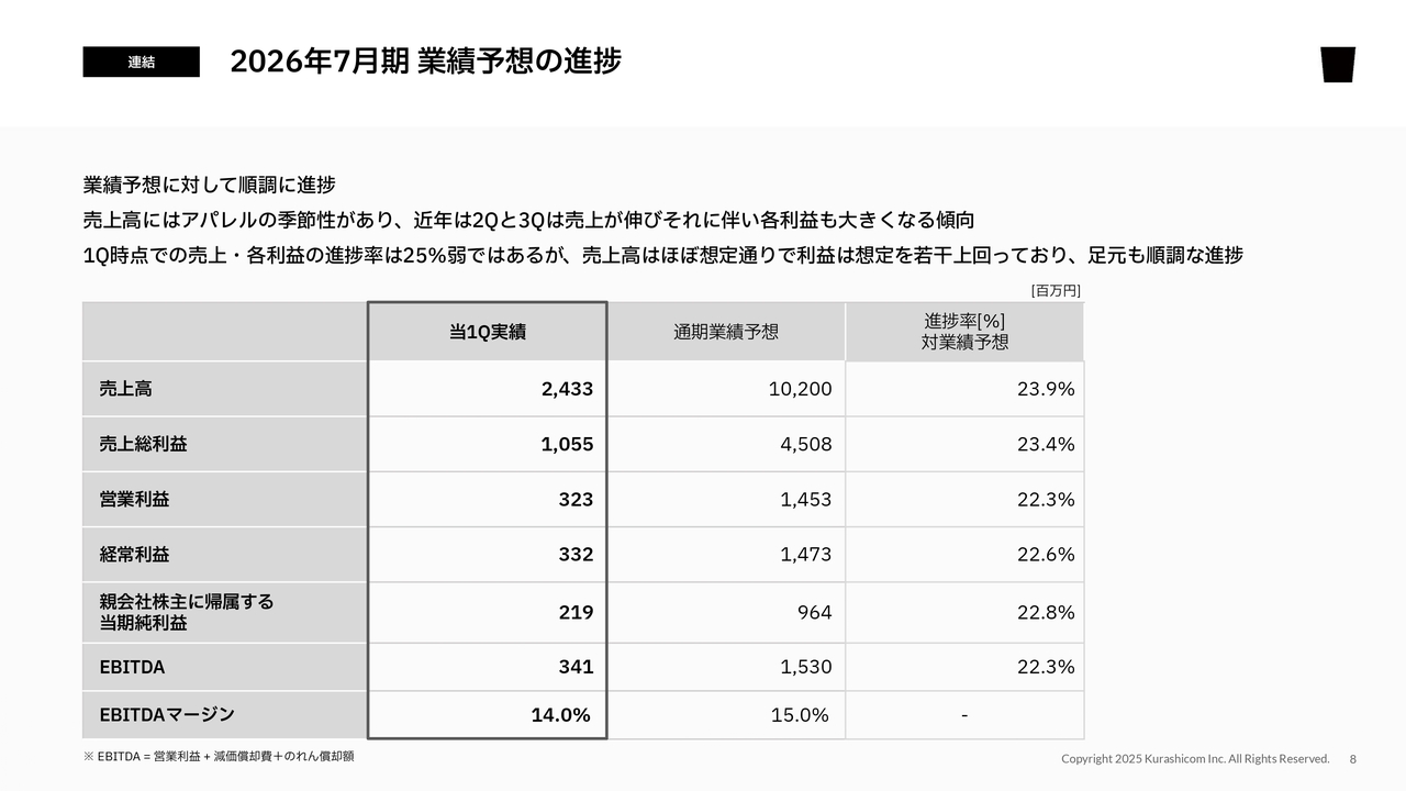 2026年7月期 業績予想の進捗