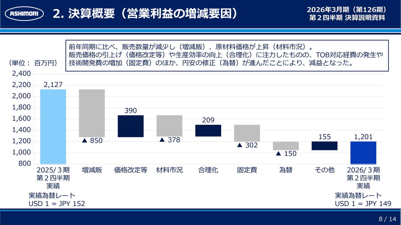 そのため、販売価格の引上げや生産効率の向上に注力したものの、TOB対応経費の発生や技術開発費の増加のほか、円安の修正が進んだことにより、減益となりました。