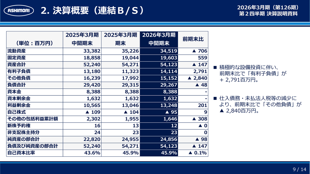 連結貸借対照表の状況はご覧のとおりです。積極的な設備投資に伴い、前期末比で有利子負債が、27億9,100万円増加しています。