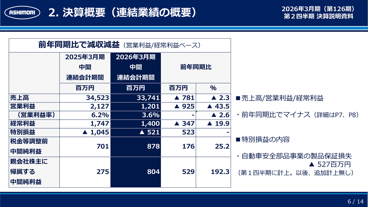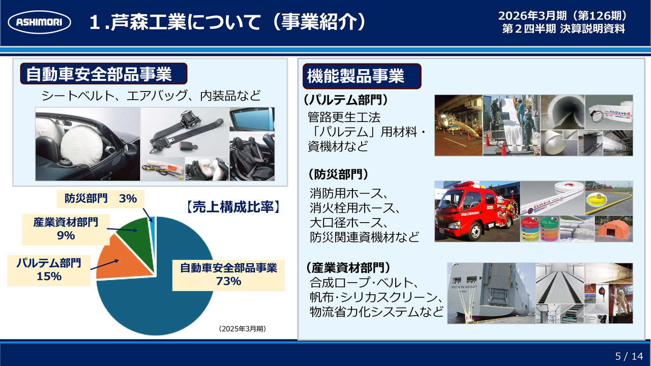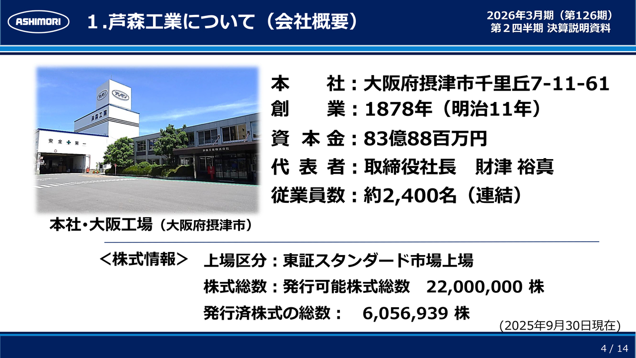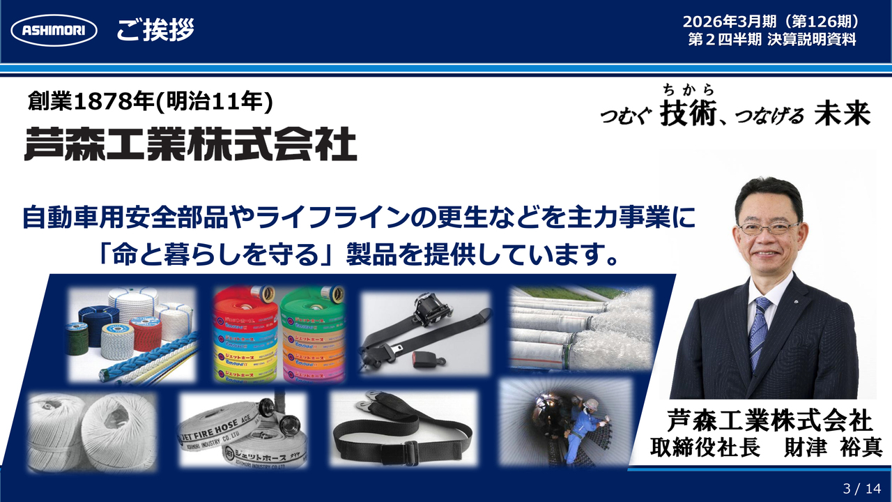 財津裕真氏:芦森工業株式会社取締役社長の財津です。どうぞよろしくお願いします。当社の概要、2026年3月期中間期の決算についてご説明します。