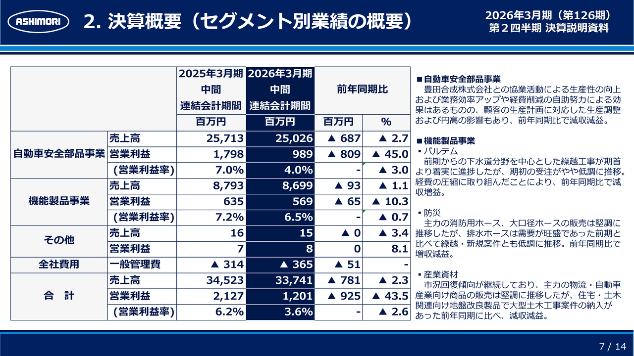 産業資材関連は、市況回復傾向が継続しており、主力の物流・自動車産業向け商品の販売は堅調に推移しましたが、住宅・土木関連向け地盤改良製品で大型土木工事案件の納入があった前年同期と比べ、売上高は32億6,000万円と6,800万円の減収、営業利益は5,300万円と7,000万円の減益となりました。
