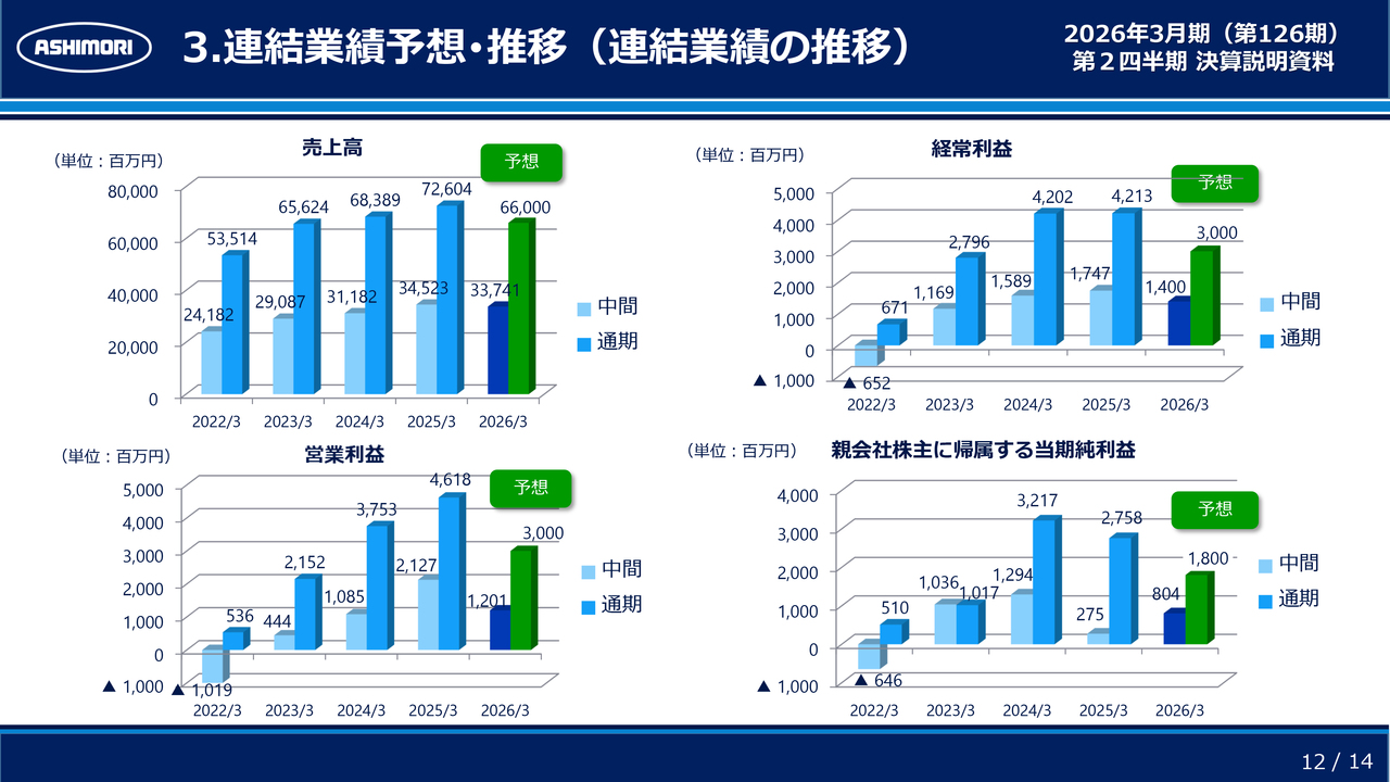 損益面は、営業利益が12億100万円と、前年同期比9億2,500万円の減益、経常利益は14億円と、前年同期比3億4,700万円の減益となりました。